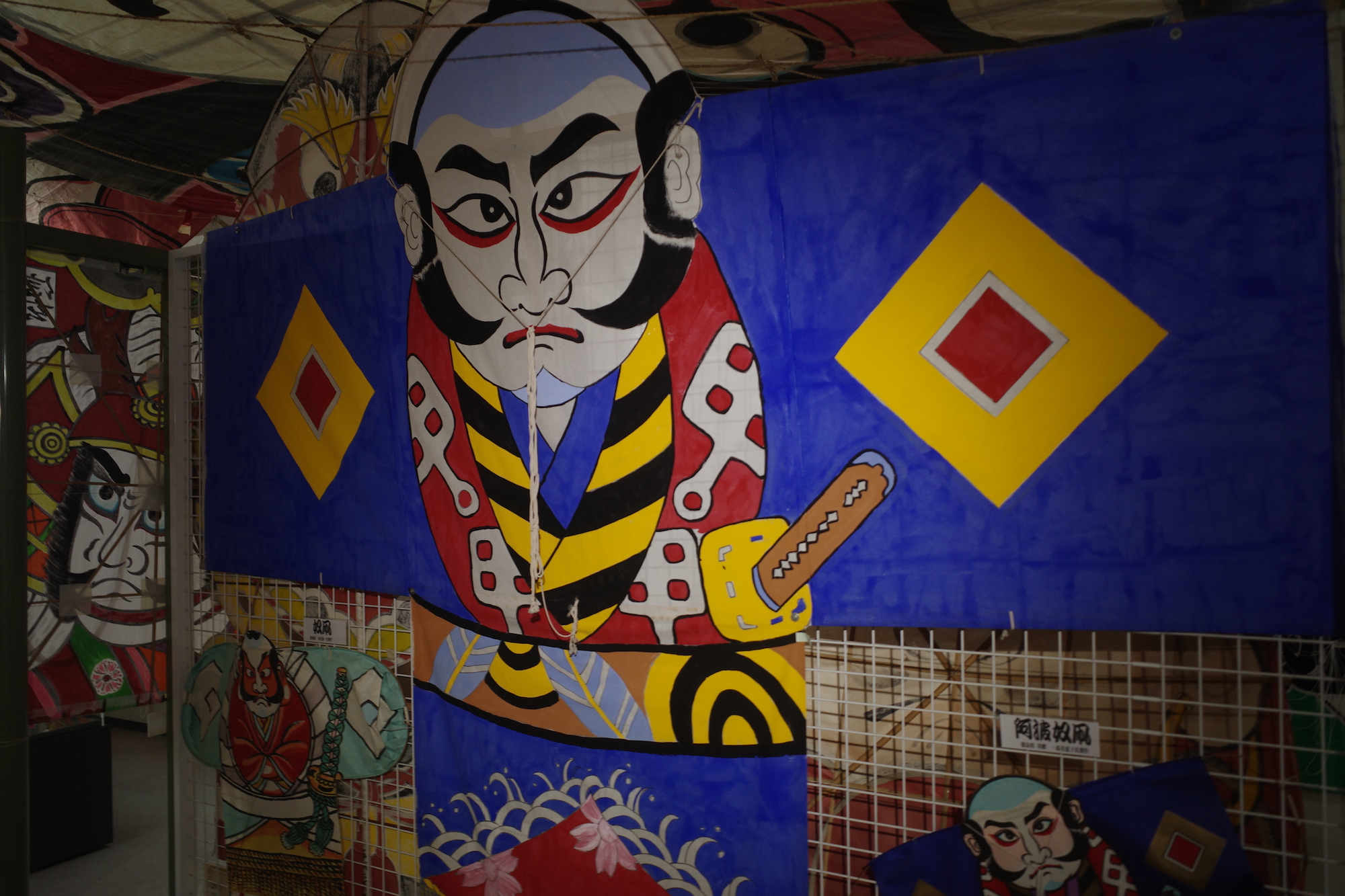 こちらは阿波(徳島県)の奴凧だ。阿波おどりの人物を凧に仕立てたといわれている。現在、生産の大半はビニール凧になっているそうだが、その中でも伝統的な奴凧が作られているようだ。大きく手を広げ、鋭い目をした奴さんのデザインがとても印象的である。