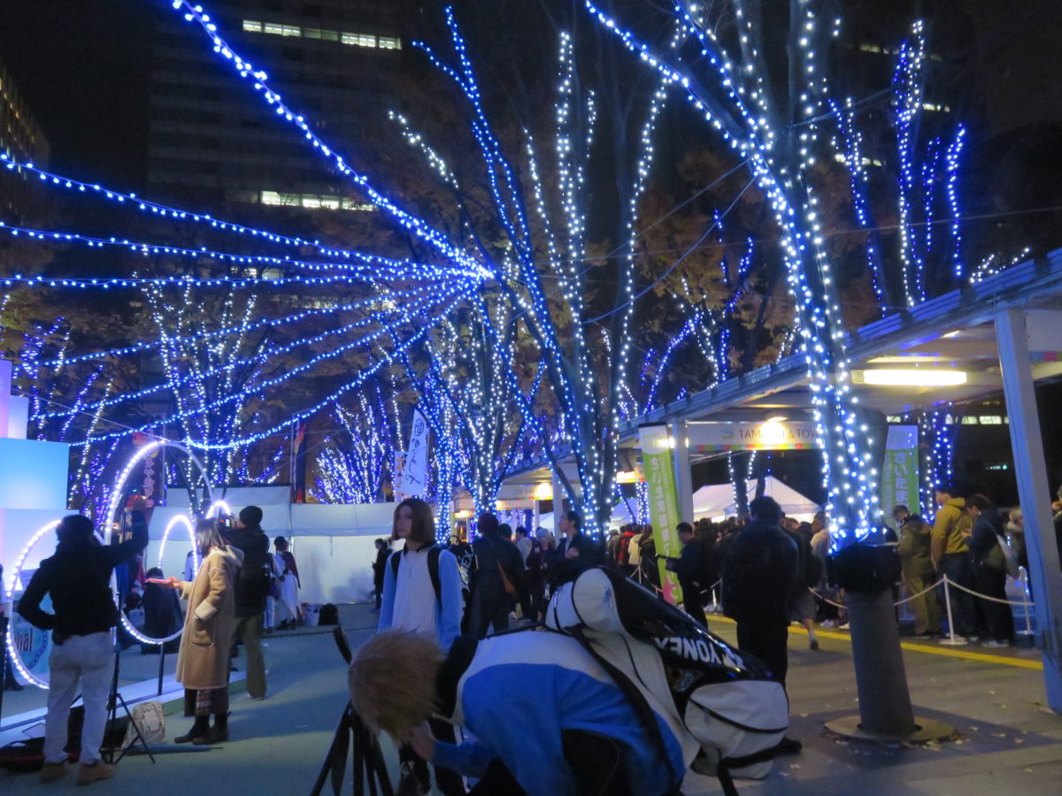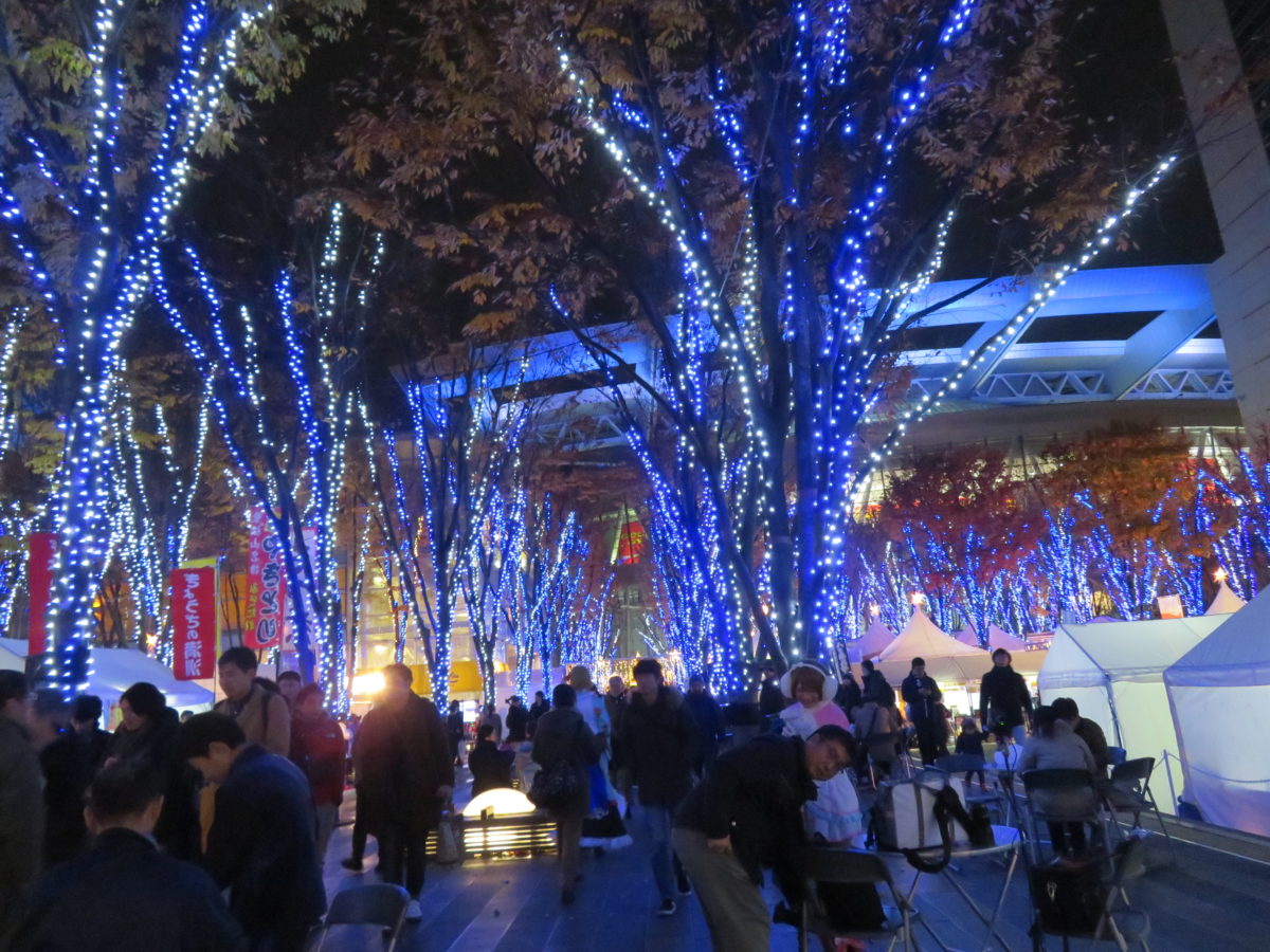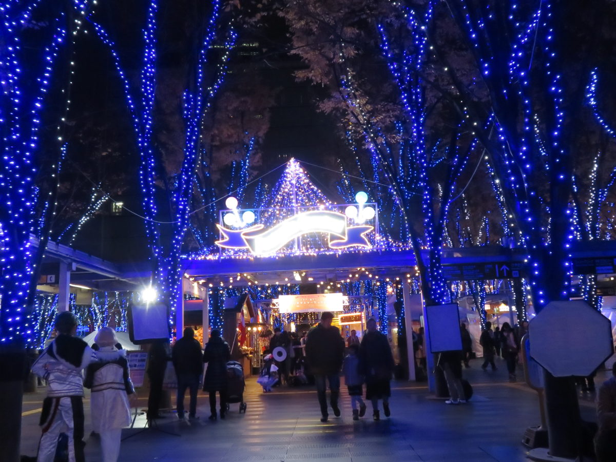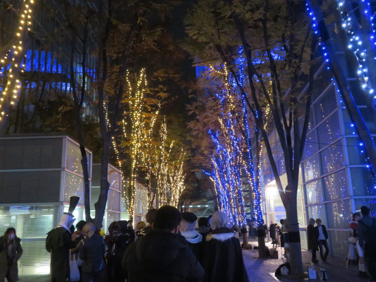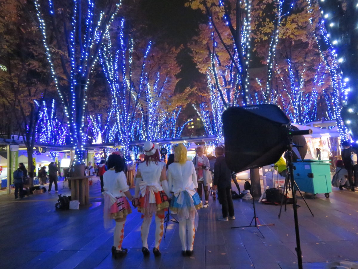 「けやきひろば」とJRさいたま新都心駅を繋ぐ通路の街路樹もイルミネーションの化粧をつけ、広場へ温かに誘導してくれます。広場では約150本のけやきの木にブルーをメインとした装飾に、シャンパンゴールド、ホワイトの光が折り重なります。ブルーの森の中心の芝生広場エリアには、パステルカラーのマジック・ボックスや流星ストリングスが設置されています。広場には好みの衣装を着て写真を撮るコスプレイヤーの姿をよく見かけます。