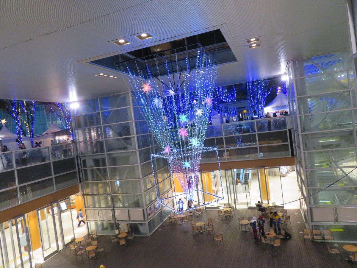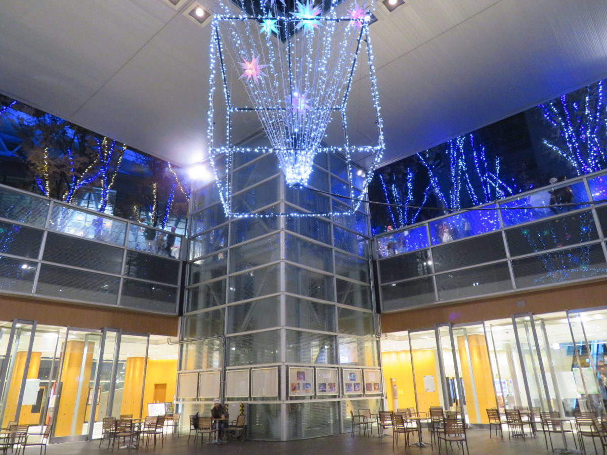 「けやきひろば」の中央の吹き抜けプラザには、マジック・ボックスをイメージしたオブジェが設置されています。箱からは光と星が飛び出し、けやきの森へと昇っていきます。広場下のフロアーにはレストランやカフェが店舗を構えており、イルミネーション鑑賞の前後に食事をすることもできます。
