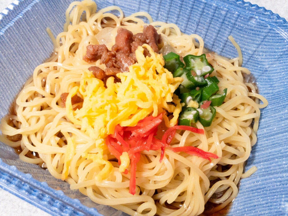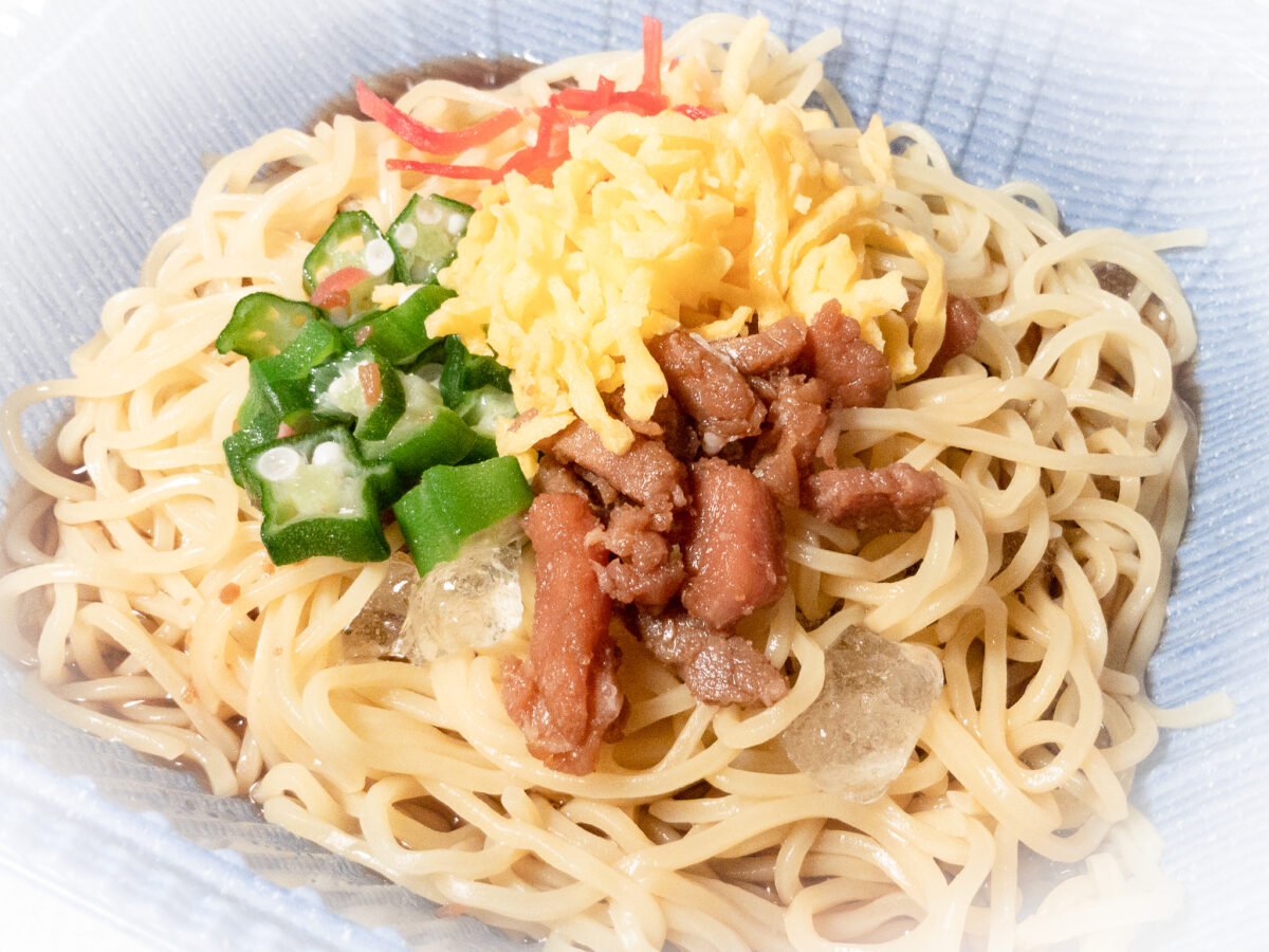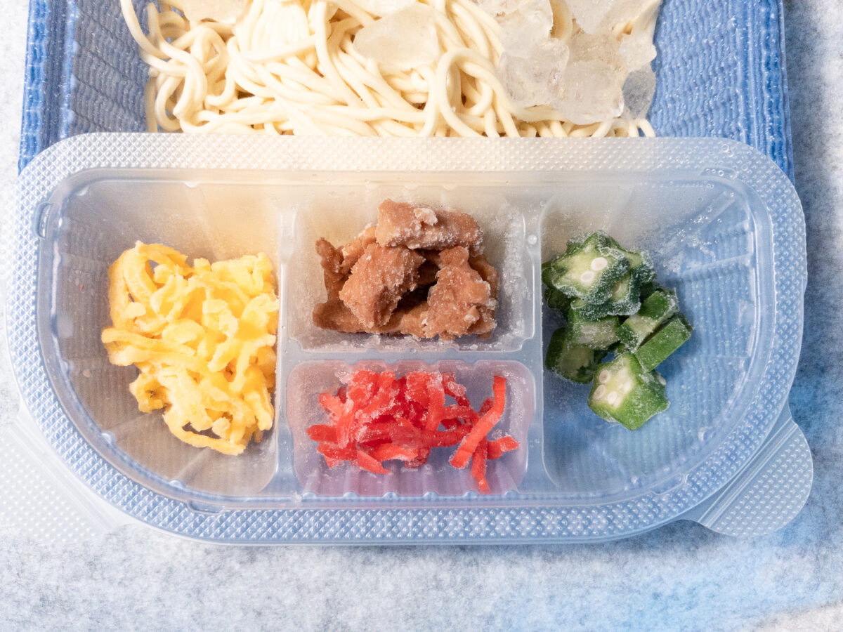 今日は冷やし中華の日。では、折角なので冷凍の冷やし中華を実食してみましょう。具材は4種類。錦糸卵、煮豚、オクラと紅ショウガが小分けされています。