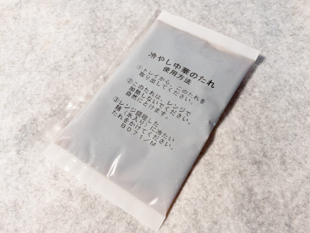 冷やし中華のたれは、電子レンジで加熱できないのでトレイから取り出しておきます。室温で解凍するので、ぬるま湯や流水などで解凍する必要もありません。