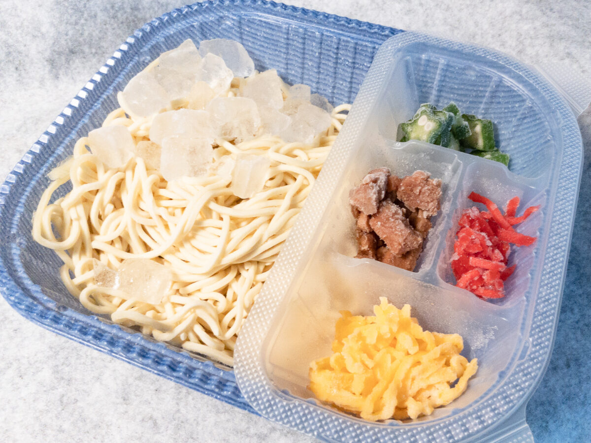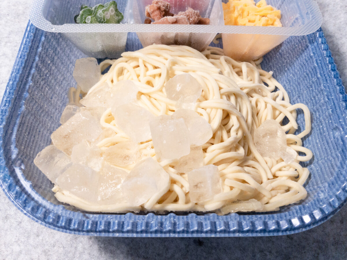 加熱が終わっても氷は残っています(ここがミソ)。具材トレイを外して、タレを入れて麺をほぐします。麺がほぐれたら、具材をトッピングしてできあがり。