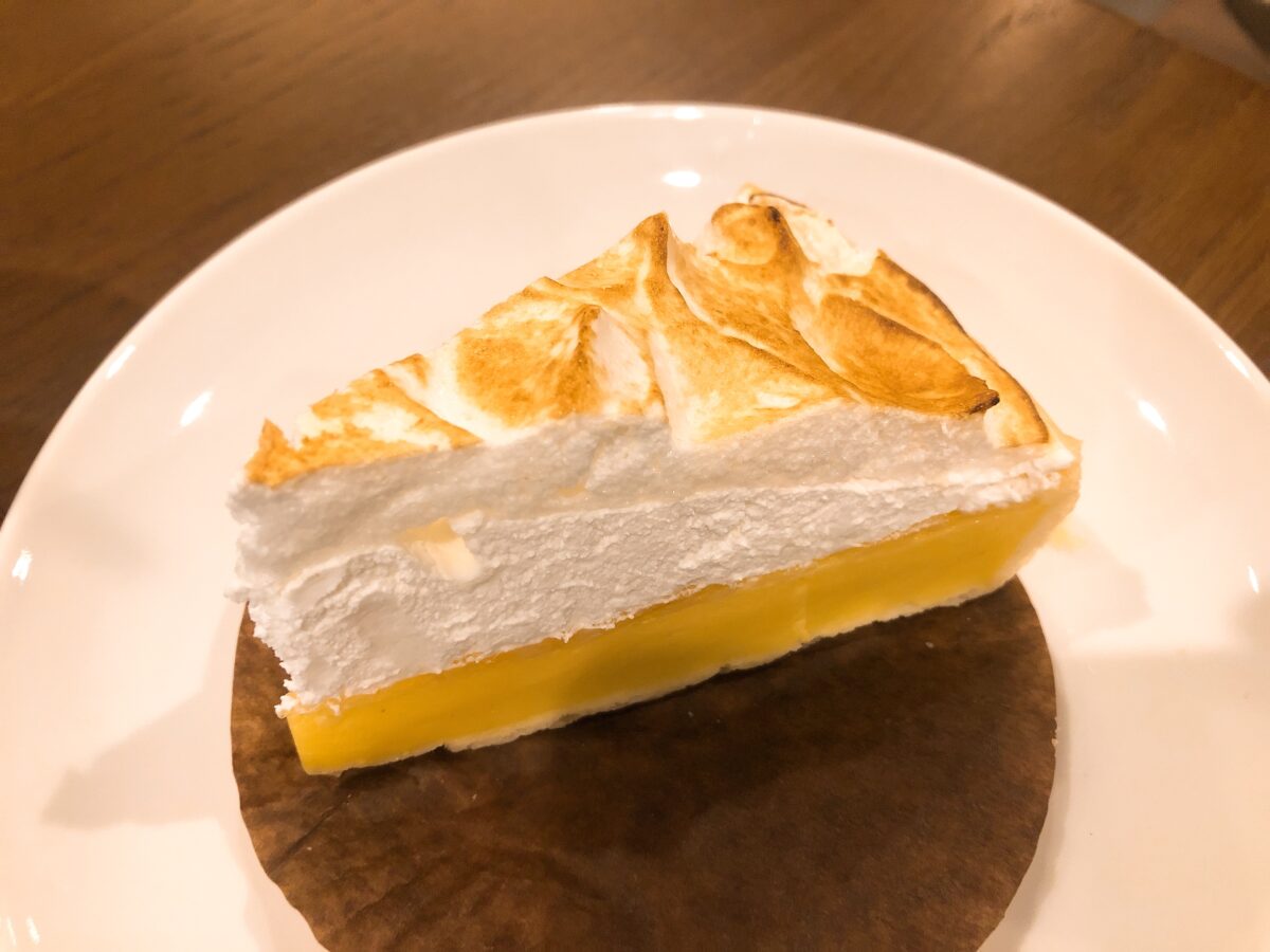 「ピンク フローズン レモネード & パッションティー」と組み合わせるデザートにおススメなのが、「レモンパイ(税込¥495)」。全体的に軽い食感で、下から2番目、薄いパイ生地の層の上にある黄色い部分がレモンの味になっています。レモン好きには嬉しい、しっかりと酸味があるタイプのレモンクリーム!黄色の層の上には、レモンピールが入った、ややつぶつぶを感じるジャムのようなもの(レモンカードと言うそうです)が薄く挟まっていて、爽やかさがアップしています。白の層の部分も良く見たら2層構造になっていて、一番上はメレンゲでできていて、しっかりとした甘みとフワフワ感がたまりません。全部の層を一緒に口に入れることで、爽やかさはあるけれどとげとげしくない、まとまりのあるスイーツに仕上がっていました。同じ柑橘の風味をもつ「ピンク フローズン レモネード & パッションティー」との相性もバッチリです。