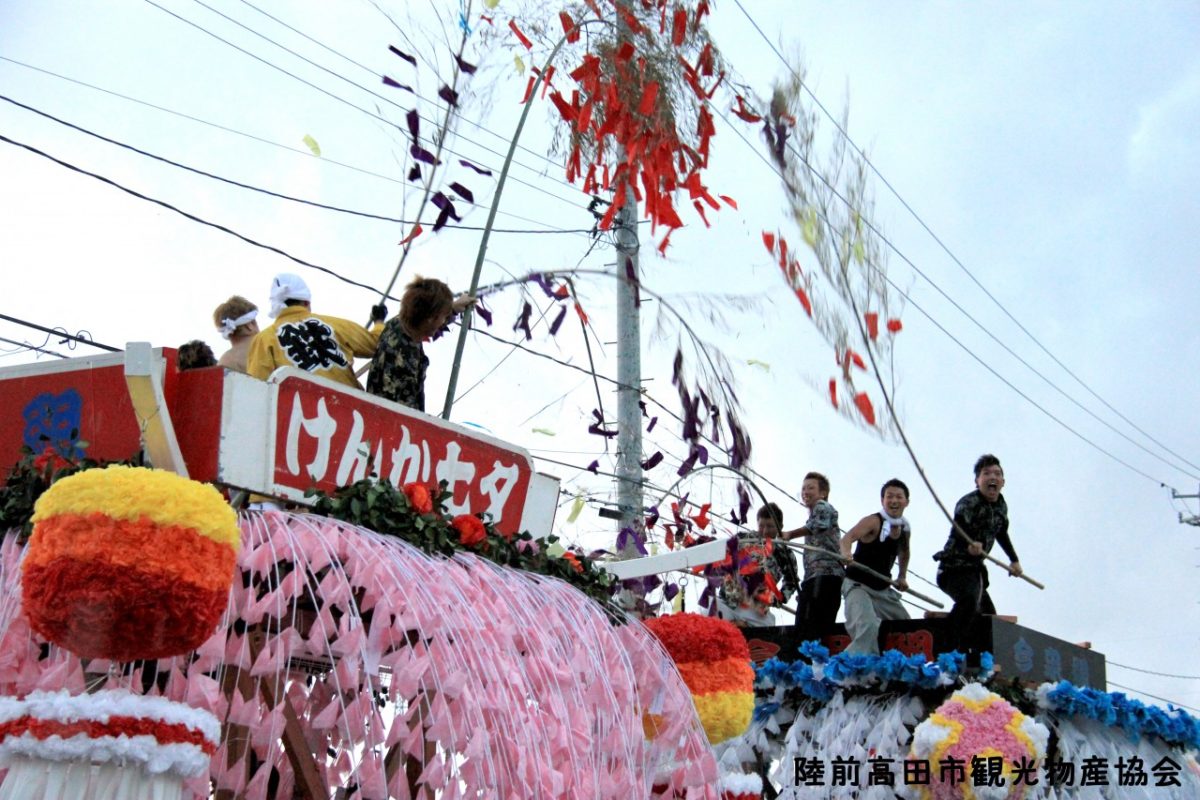 「うごく七夕」は高田町の夏の伝統行事で、先祖供養をするために始まったとされ、東日本大震災が発生してからは犠牲となった方々への鎮魂のほか、復興支援に対する感謝の意味も込められています。「けんか七夕」は気仙町今泉地区で行われており、約900年の歴史があると言われていて、岩手県指定無形民俗文化財にも指定されています。