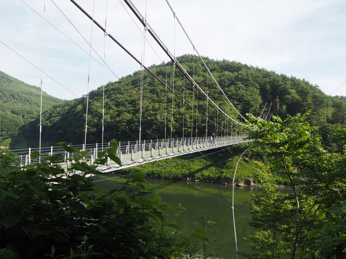 1988(昭和63)年より、旧建設省によるダム湖周辺地域の活性化を目的としたレイクリゾート事業の対象に指定され、キャンプ場やボート場などのレジャー施設が作られました。遊歩道と繋がっている吊り橋があり、湖を一望できます。