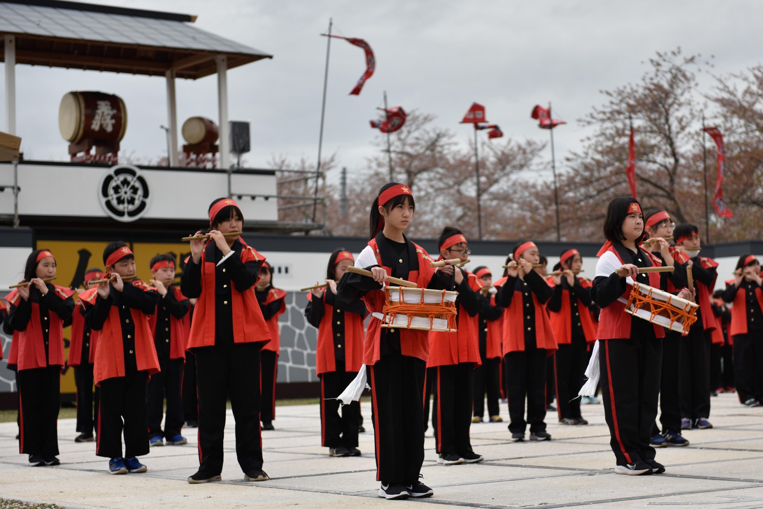 その後は堂々とした太鼓や華麗な笛が鳴り響く、天童南部小学校による、維新軍楽隊の演奏も行われました。明治維新時の戦いで演奏された楽隊の様子を再現したものです。