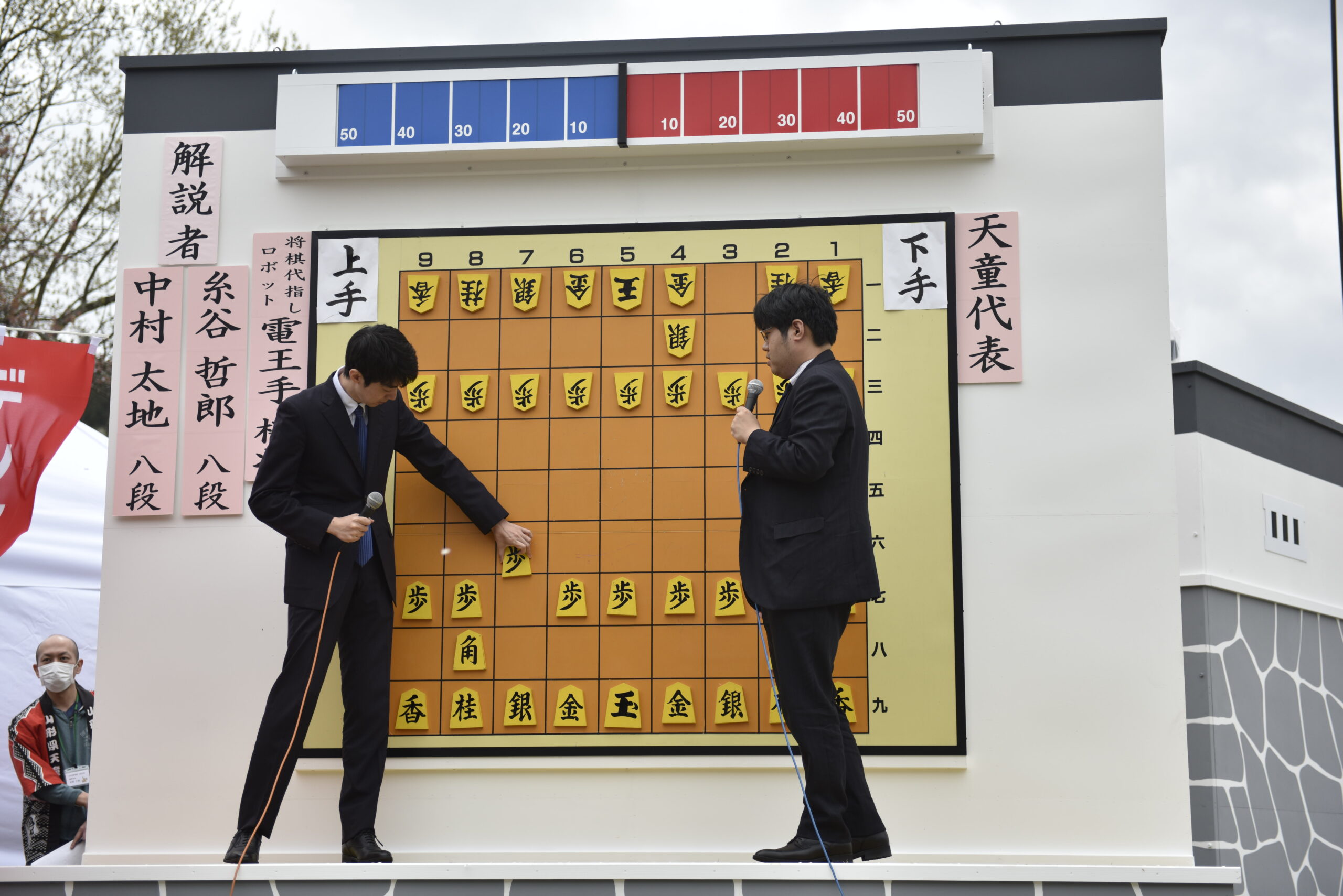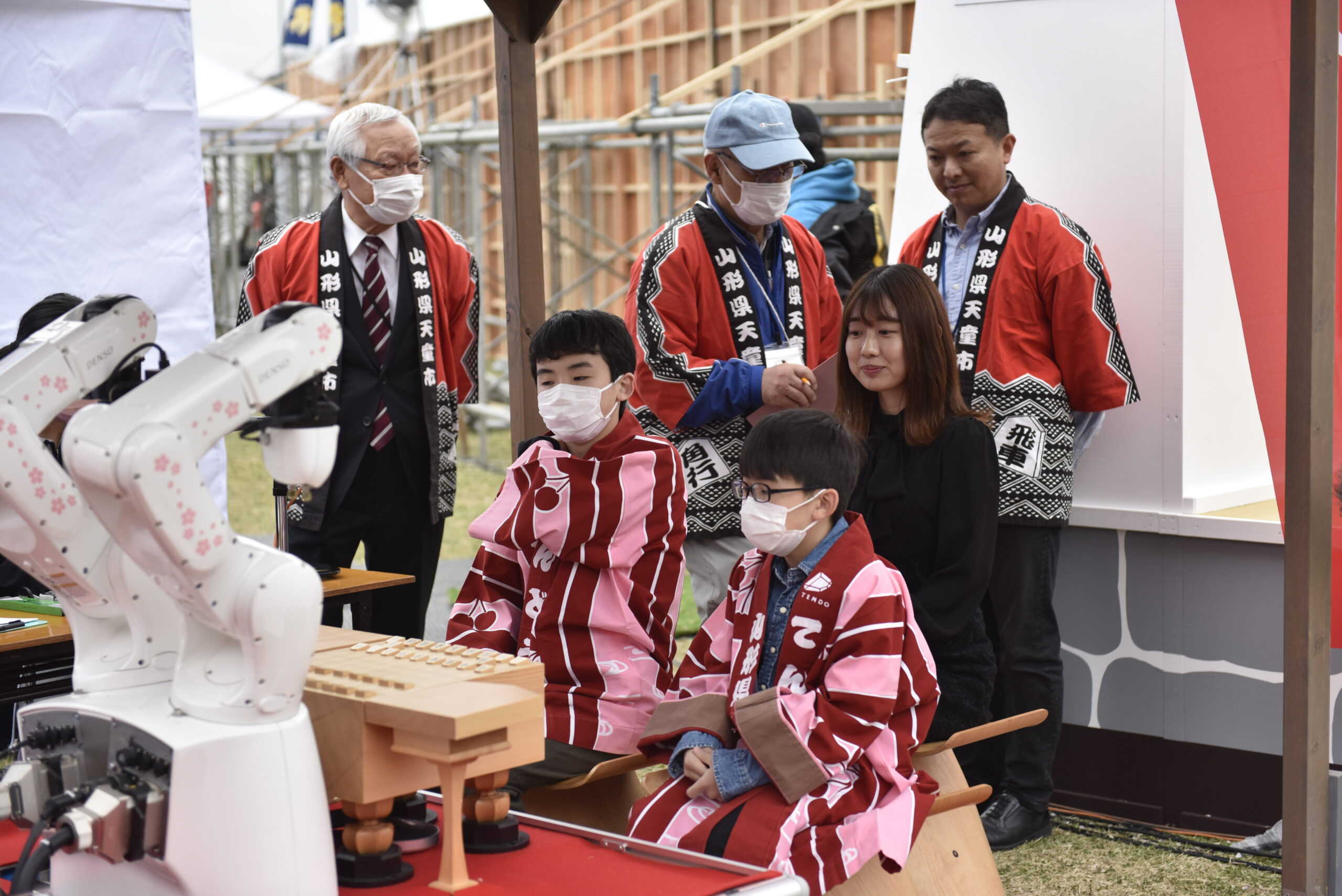 将棋代指しロボット「電王手桜将(おうしょう)」と、日本将棋連盟天童支部の高橋遥輝(はるき)さんと高橋陽向(ひなた)さんが対局。