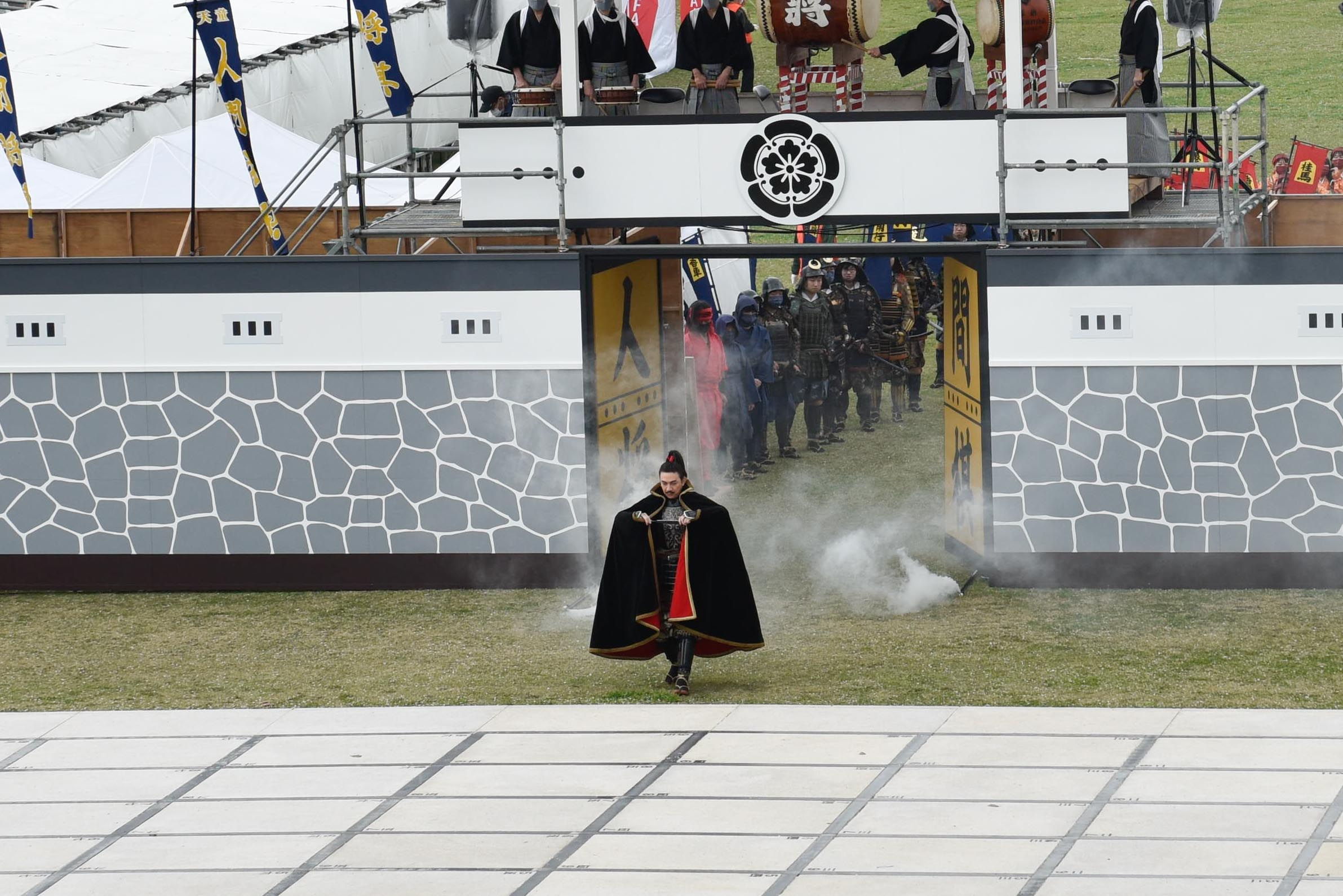 12時半から、いよいよ人間将棋の時間になりました!対局の前に、戦国武将が登場して盛り上げます。