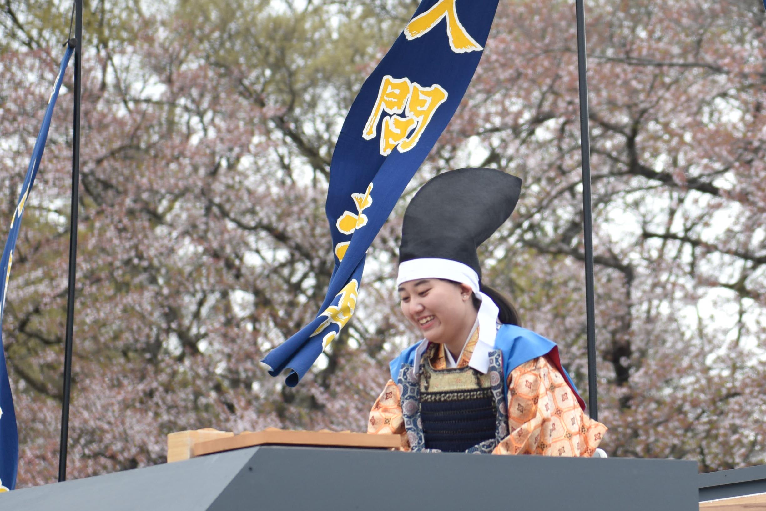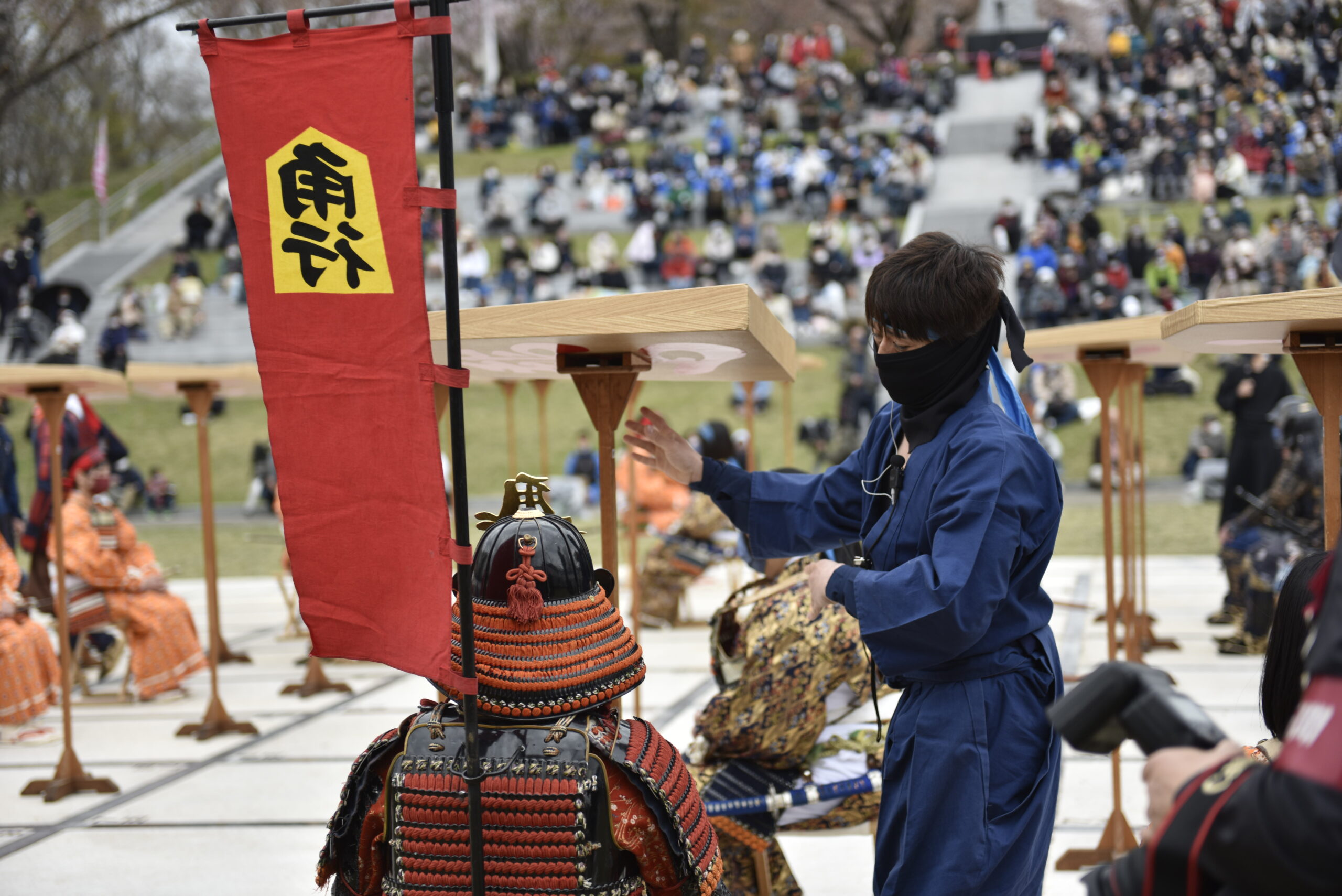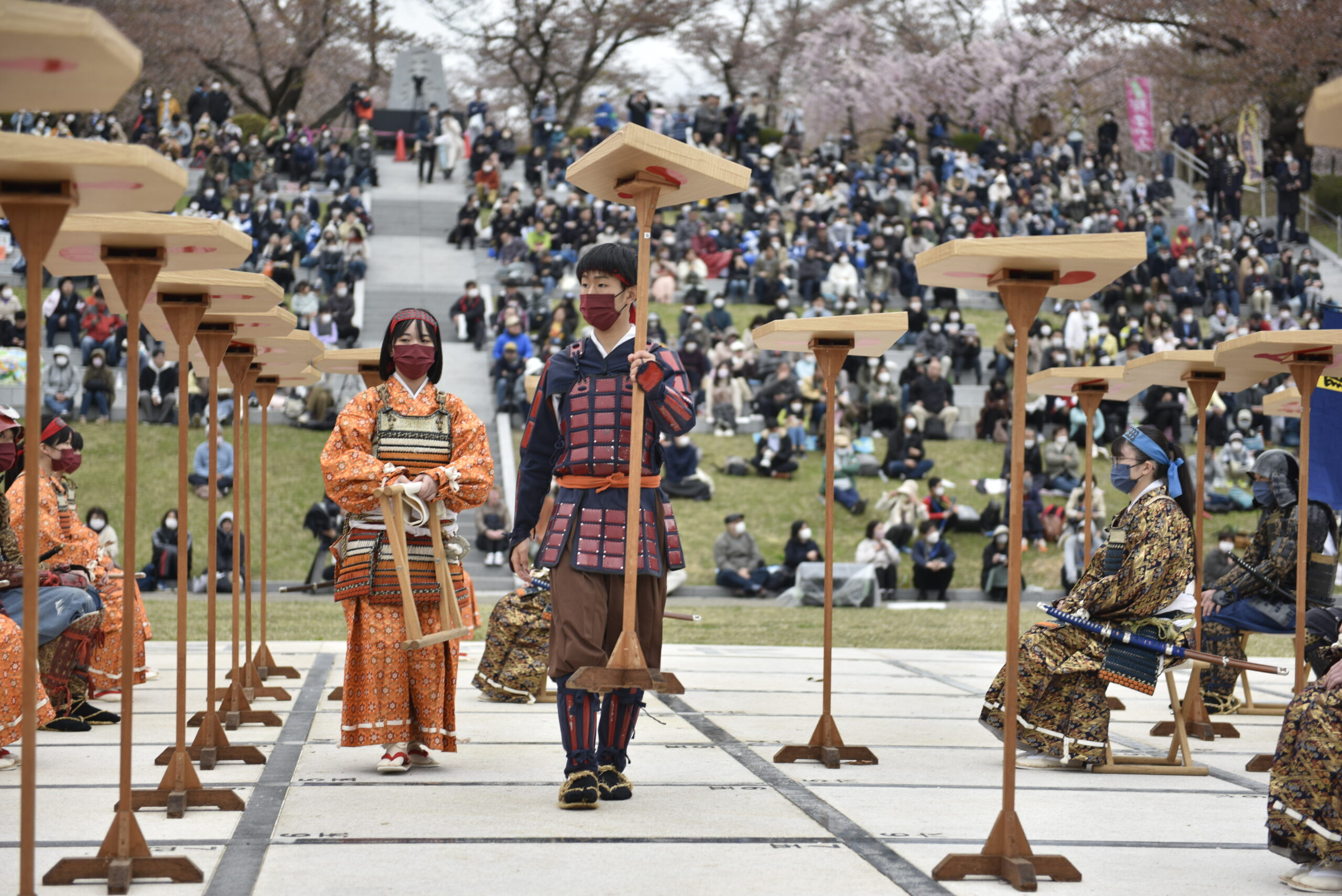 天童高等学校と創学館高等学校の生徒が、駒武者となって姿を現しました。