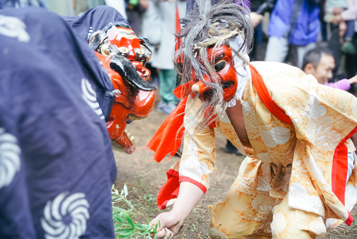 3匹の天狗が船から飛び出し、広い境内を裸足でかけ回り、坂を転げ落ち、高い所から飛び降りたり、子どもをさらったりと、破天荒にやりたい放題暴れ回る奇祭。また4頭の獅子が子どもたちを噛み、無病息災と幸せを与える悪魔払いを行います。この地を訪ねた獅子と土着の天狗との間の国譲りが由来だとか。