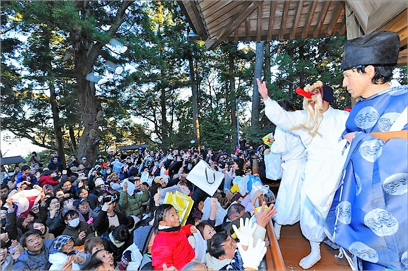 元々は無礼講として、その日だけはどんな悪態も許されたことが由来だとか。村の各所にお供えものをして回る天狗に対して「遅いぞ、バカヤロウ!」「早く歩けよ、コノヤロウ」など数々の暴言をはくことが許されます。見物客のいかなる暴言にも無言で耐え続ける天狗の姿に癒されます。また各所に置かれるお供えものは、早い者勝ちで奪い合うというバトル形式。こちらはお供え前にフライングすると、普通に天狗から注意されます。最後は山の頂上の神社の境内で天狗が盛大に餅まきを行い、フィナーレとなります。