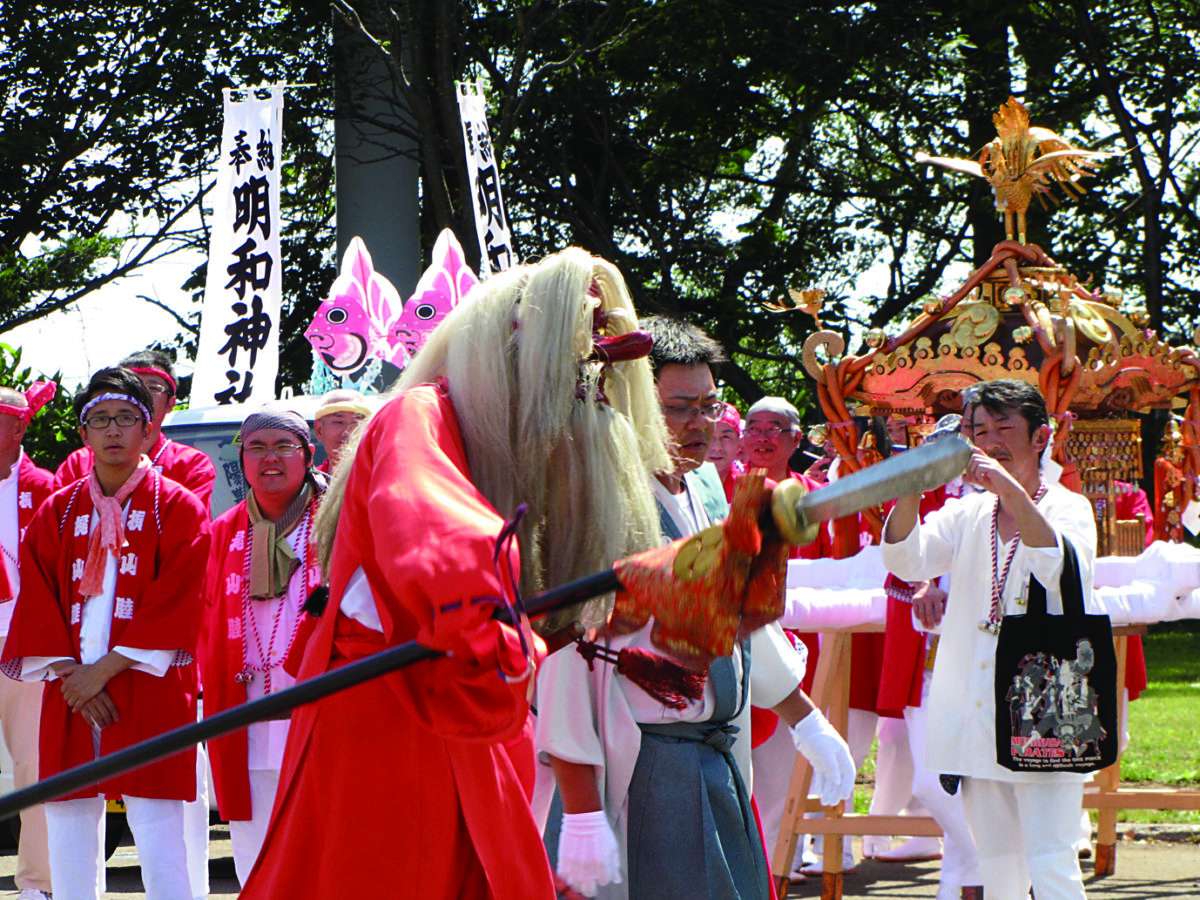 美麗な衣装に身を包んだ猿田彦(天狗の原型と言われます)が華麗なダンスをくり広げるお祭り。猿田彦の先導により、町内の19の集落から高さ20メートルの大枠旗を備えた神輿が、「イヤサカサー」の掛け声とともに本社に参入します。