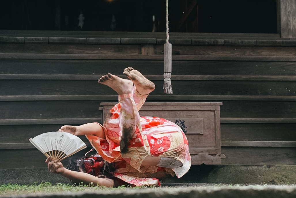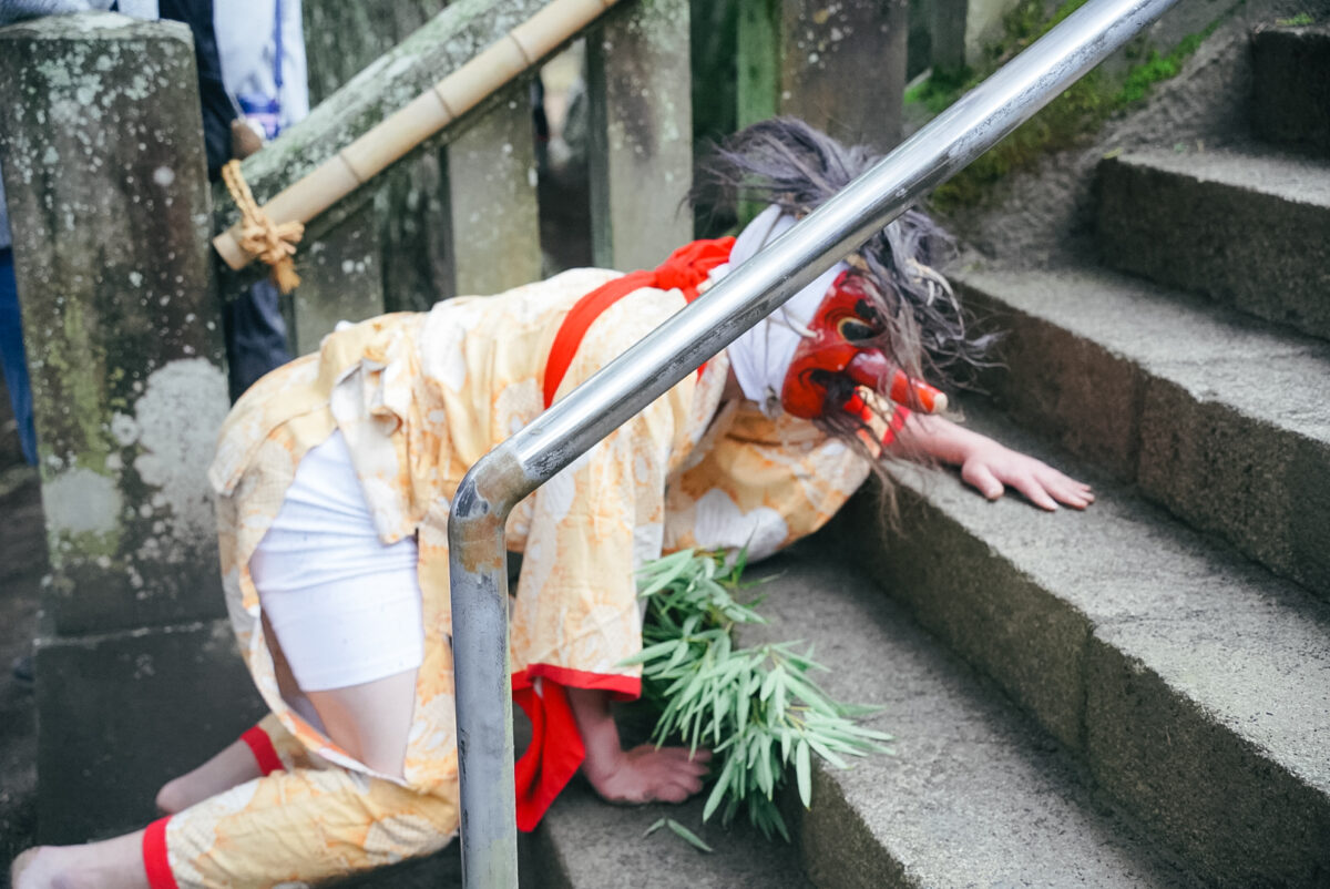 視界が悪いのを補うためかそういう慣例なのか、天狗は基本、あまり二足歩行をしない。本殿に続く階段もはって上がる。まるで赤子かケモノか。暗黒舞踏めいた聖性と獣性を同時に感じさせる。