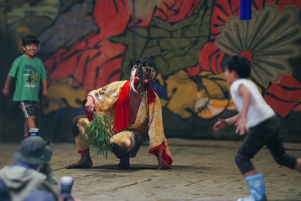 いきなり登場した異形ニキの存在に少し引き気味の観客たち。「あれって本物?」「馬鹿、中身はただのおじさんだよ」という地元の子どもたちのやり取りがほほえましい。