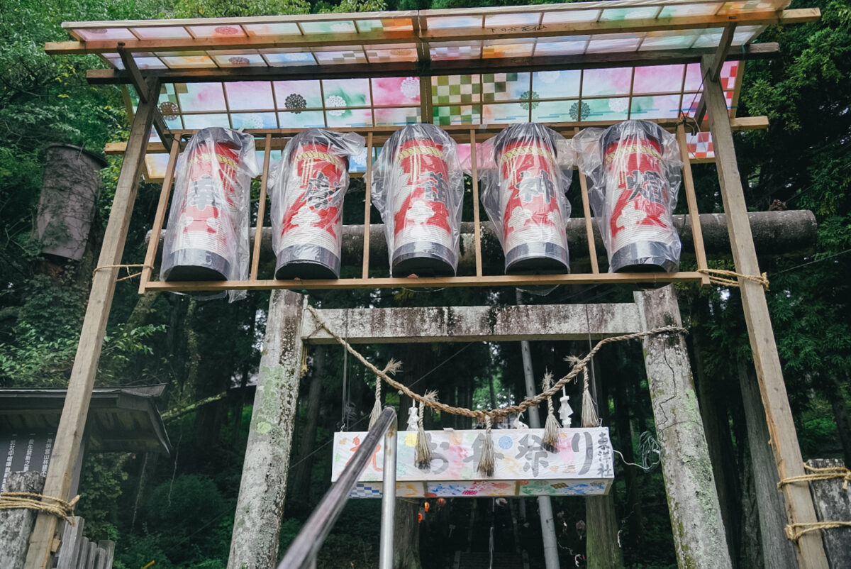 ふもとの大鳥居には秋祭りらしい飾りつけが。この手作り感とカラーリングがなかなかに良き。