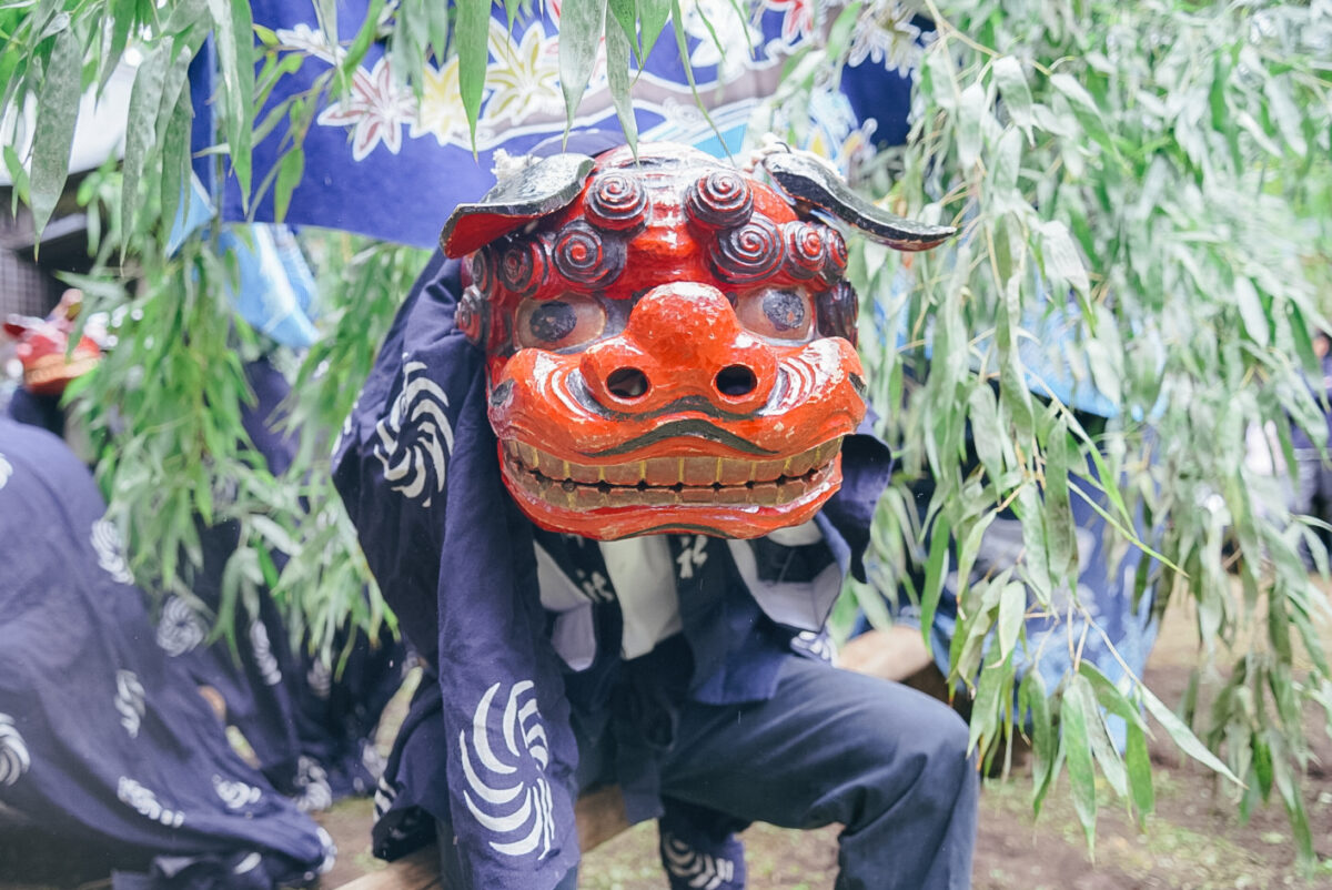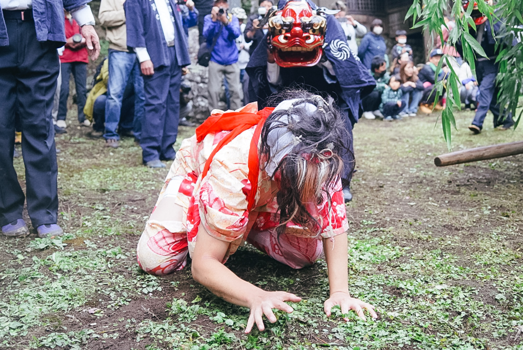 祭りの由来は「悪魔払いの儀式」とも「国譲りの和議のひとこま」とも言われ、土地に伝わる神話を再現しているのだとか。何でも大昔、船に乗って獅子が渡来し、上陸しようと天狗に相談。天狗は土地の神々を参拝し、住民とも相談したが協議は難航。天狗は参拝と相談をくり返し、三番天狗でようやく話がまとまったのだという。こうして無事に獅子は上陸。その時、獅子は踊りまわって住民にかみつき、無病息災・悪魔祓い・雨乞いなどの祈願が叶えられたという。