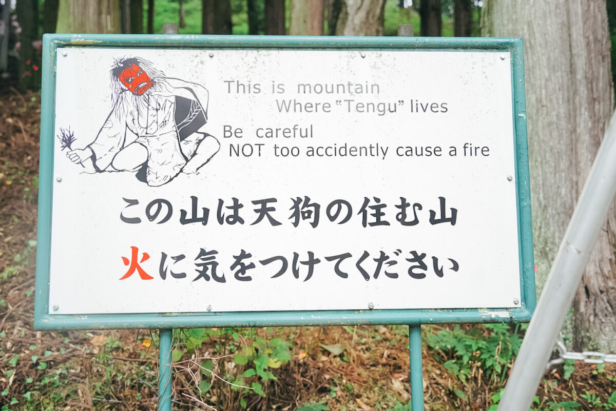 神明神社が鎮座する神明山のふもとに到着するなり、いきなりの注意喚起。天狗の実在を主張する看板がお出迎えだ。