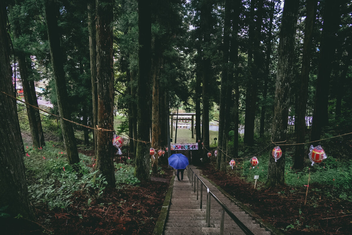 ほっこりしているのも束の間。神社への参道は杉の社叢に囲まれた、勾配が急な石段の一本道を上がらなければならない。こ、これは心臓破りというもの。