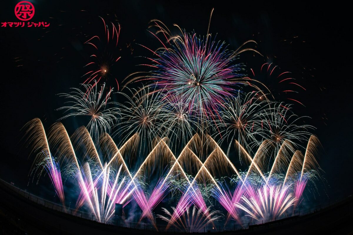約200mのワイド展開のために今年も2基の大型アルマジロを導入し、音楽にシンクロする大迫力の花火を演出します。