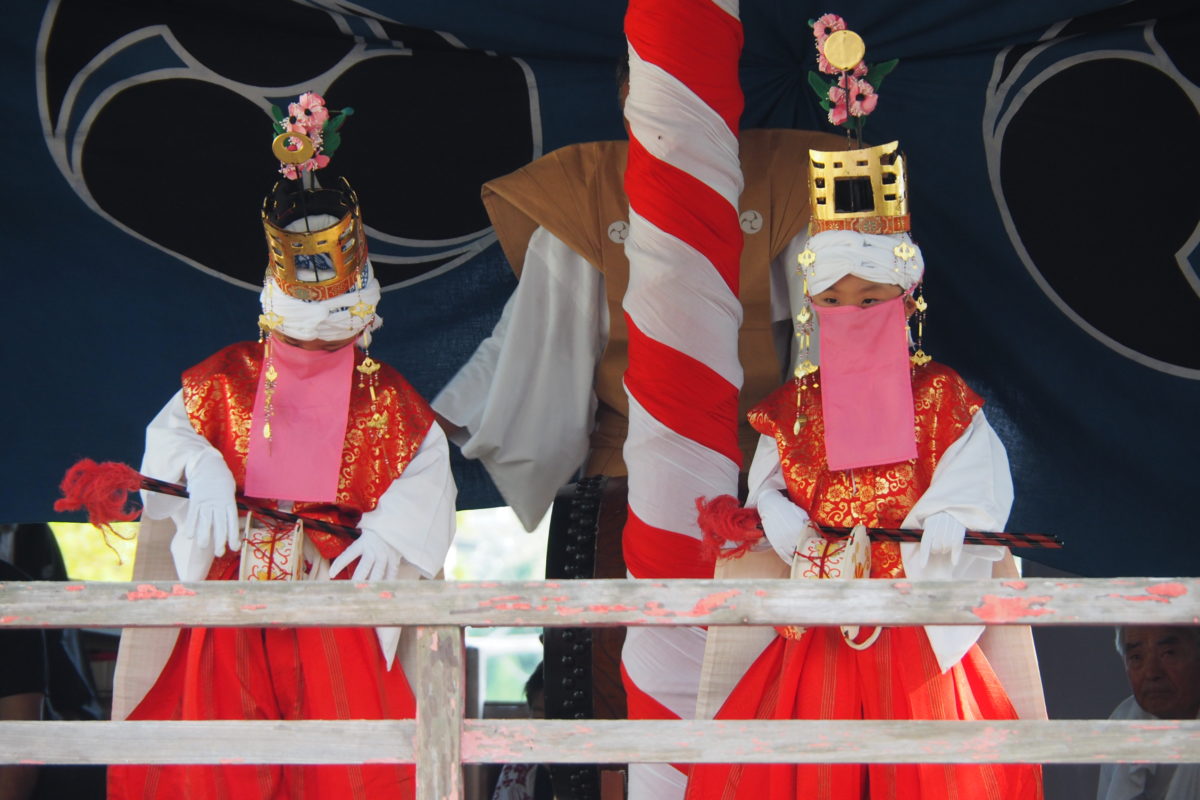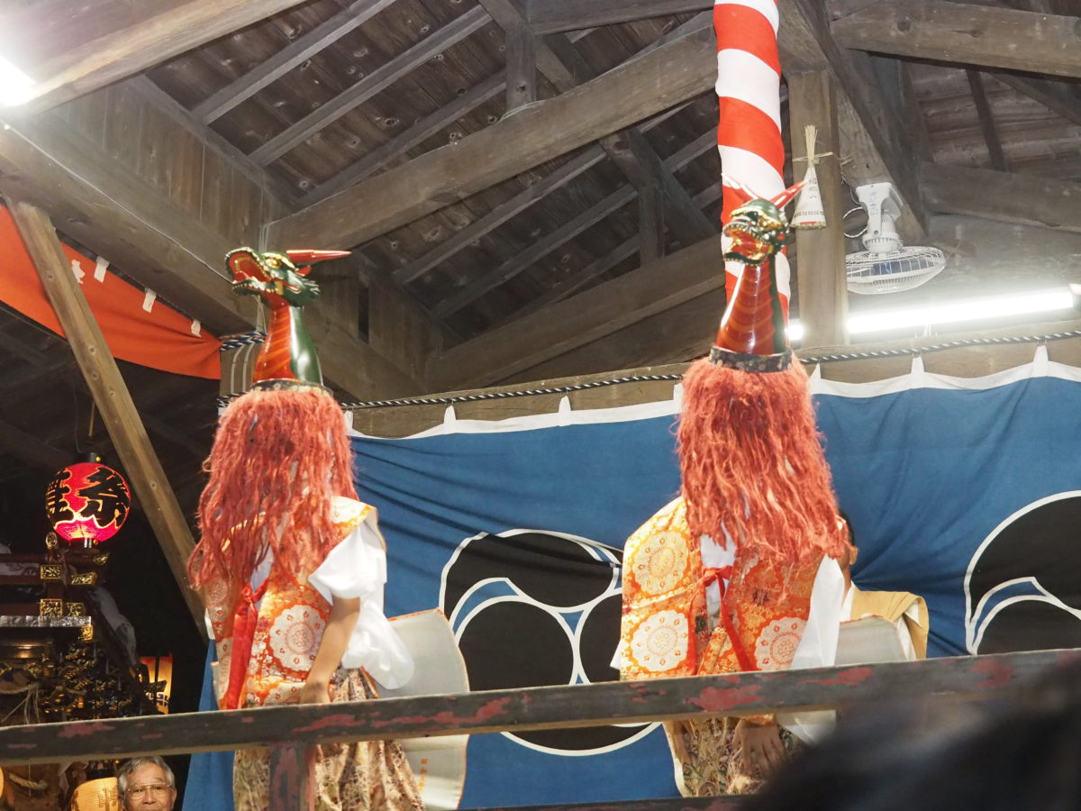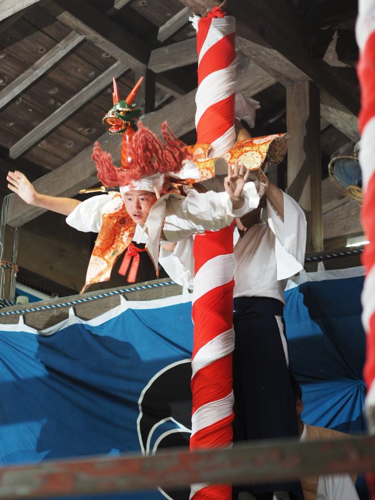 2人の子どもが龍頭を被って左右の丸柱によじ登り、逆さになって上半身を上下にあおる曲芸的な舞です。雨乞いの所作と言われています。