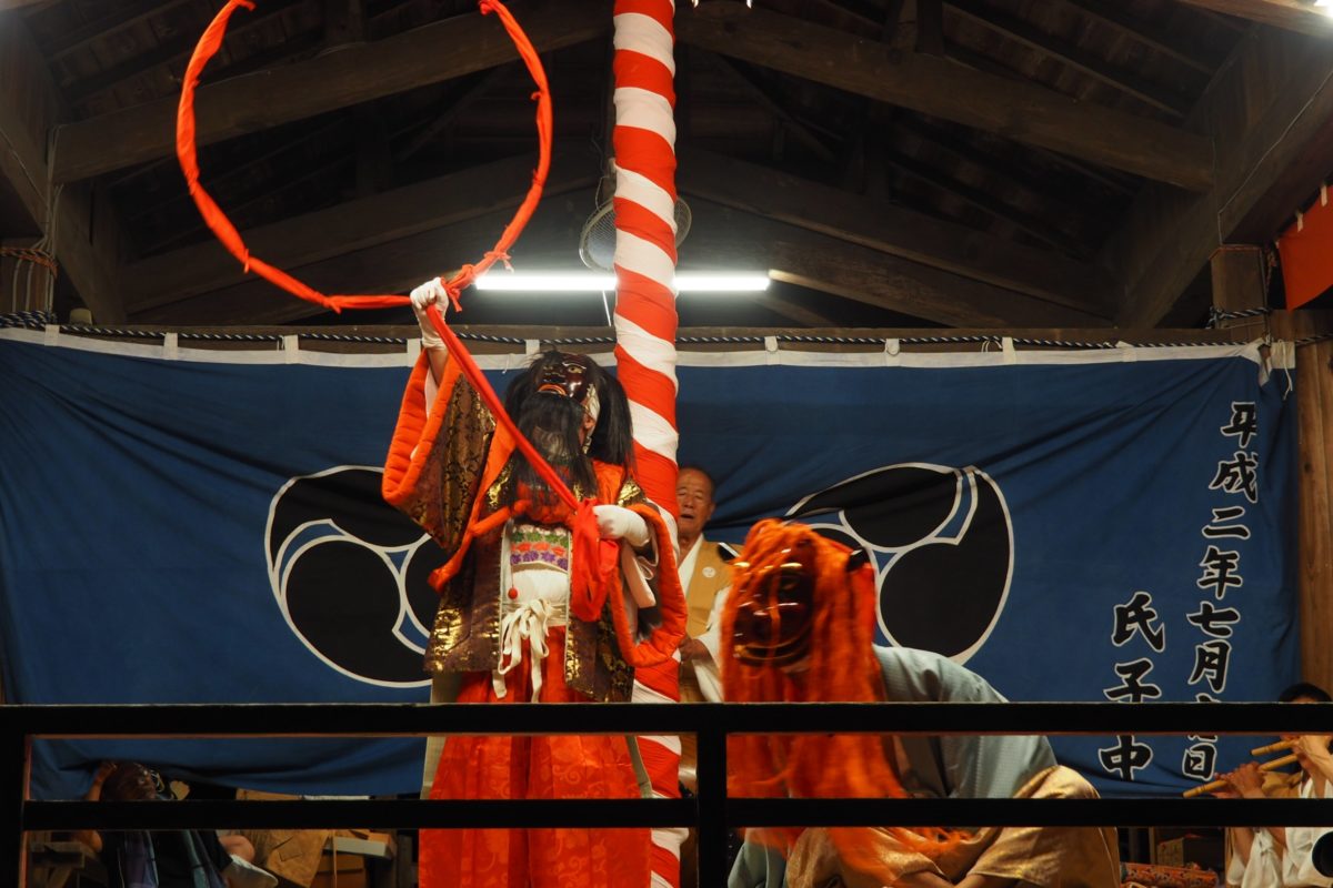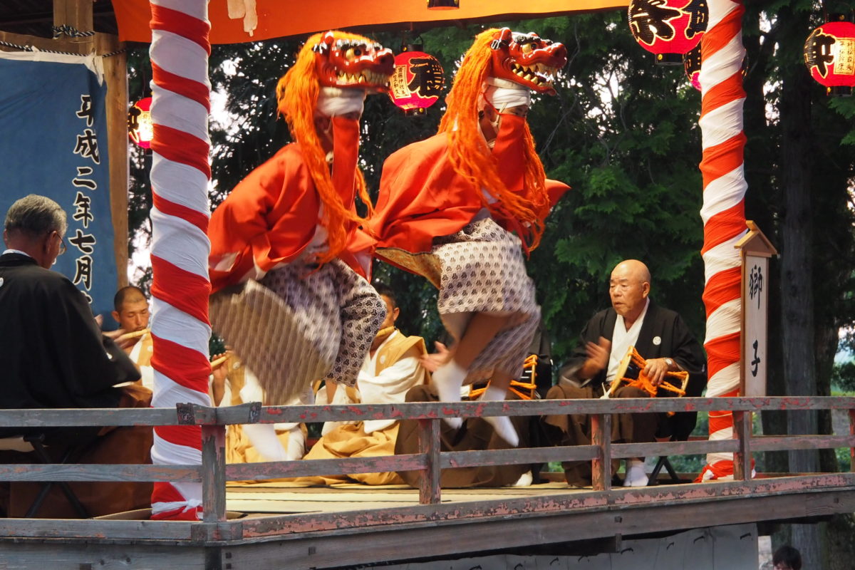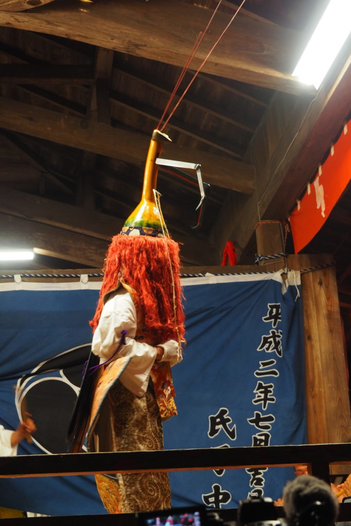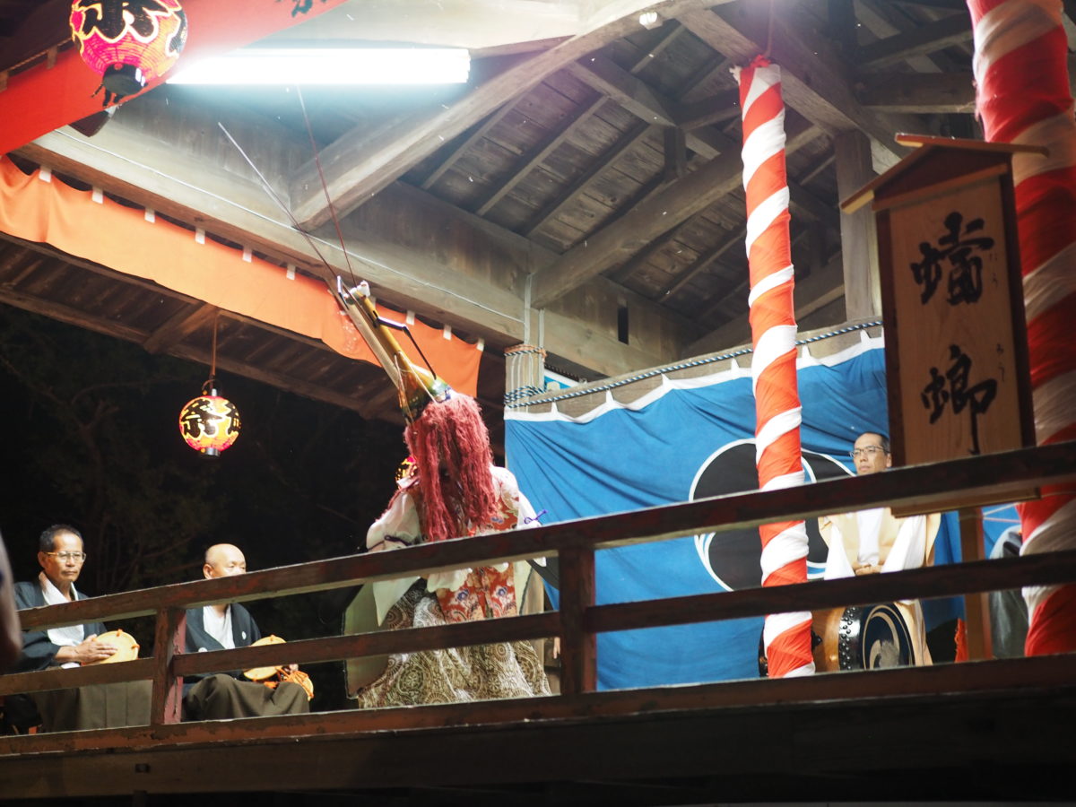2人の子どもが龍頭を被って左右の丸柱によじ登り、逆さになって上半身を上下にあおる曲芸的な舞です。雨乞いの所作と言われています。