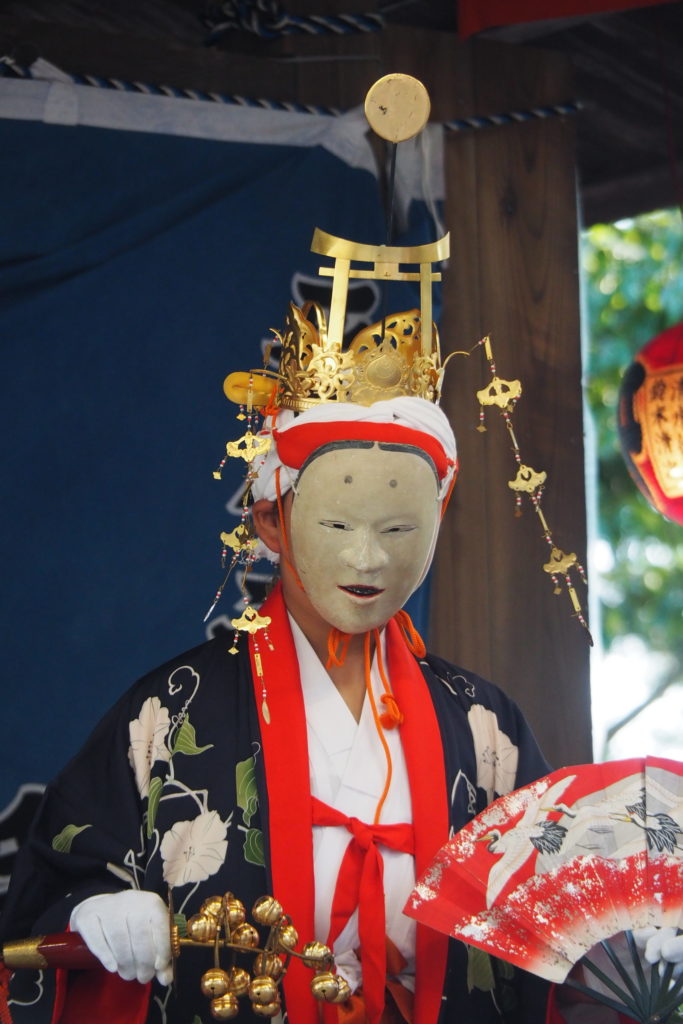 若い女性の面を付け、夕顔柄のうちかけを着て、扇と鈴をもって前後する所作を基本に舞います。