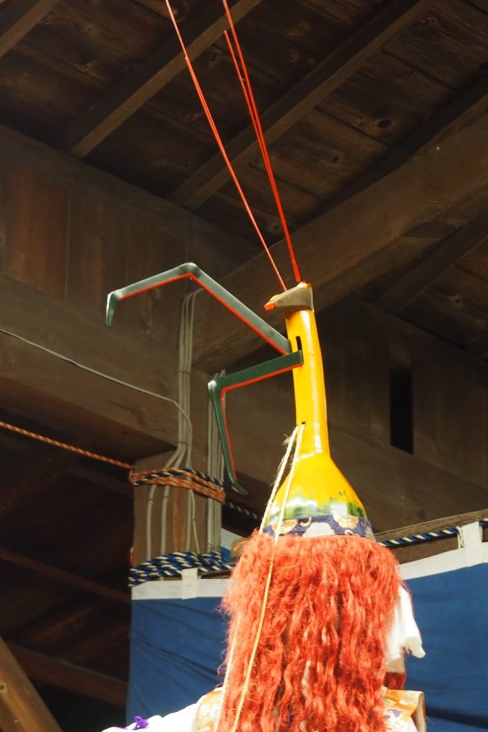 蟷螂は文字通りカマキリの被物を頭に付け、背中に4枚の羽根を背負って舞います。京都祇園祭の室町時代の文献には、このようなカマキリの装束を着けた子どもたちが巡行に参加したと記されているようです。