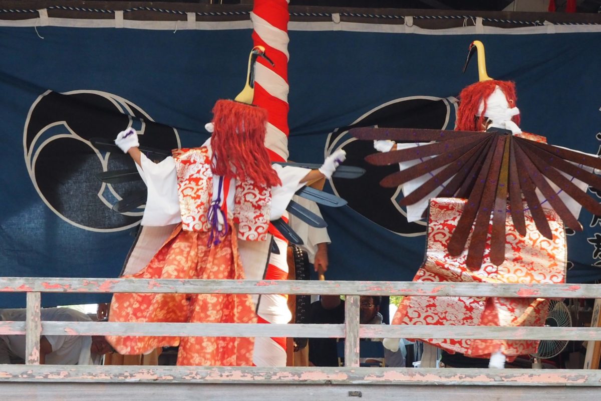 阿吽の2羽の鶴が舞います。 装束は同じ京都祇園祭をルーツとする津和野の鷺舞に似ています。