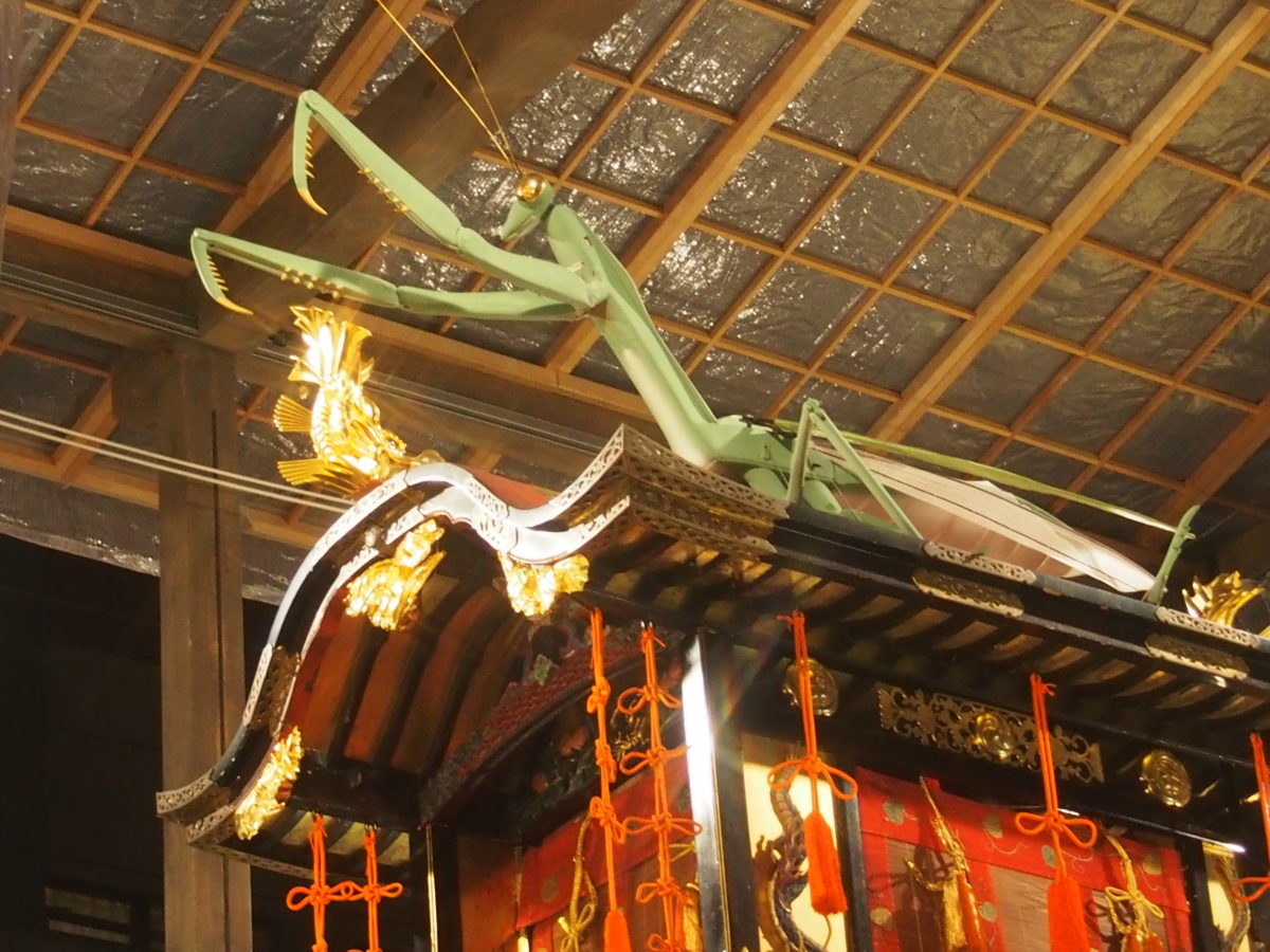 蟷螂は文字通りカマキリの被物を頭に付け、背中に4枚の羽根を背負って舞います。京都祇園祭の室町時代の文献には、このようなカマキリの装束を着けた子どもたちが巡行に参加したと記されているようです。
