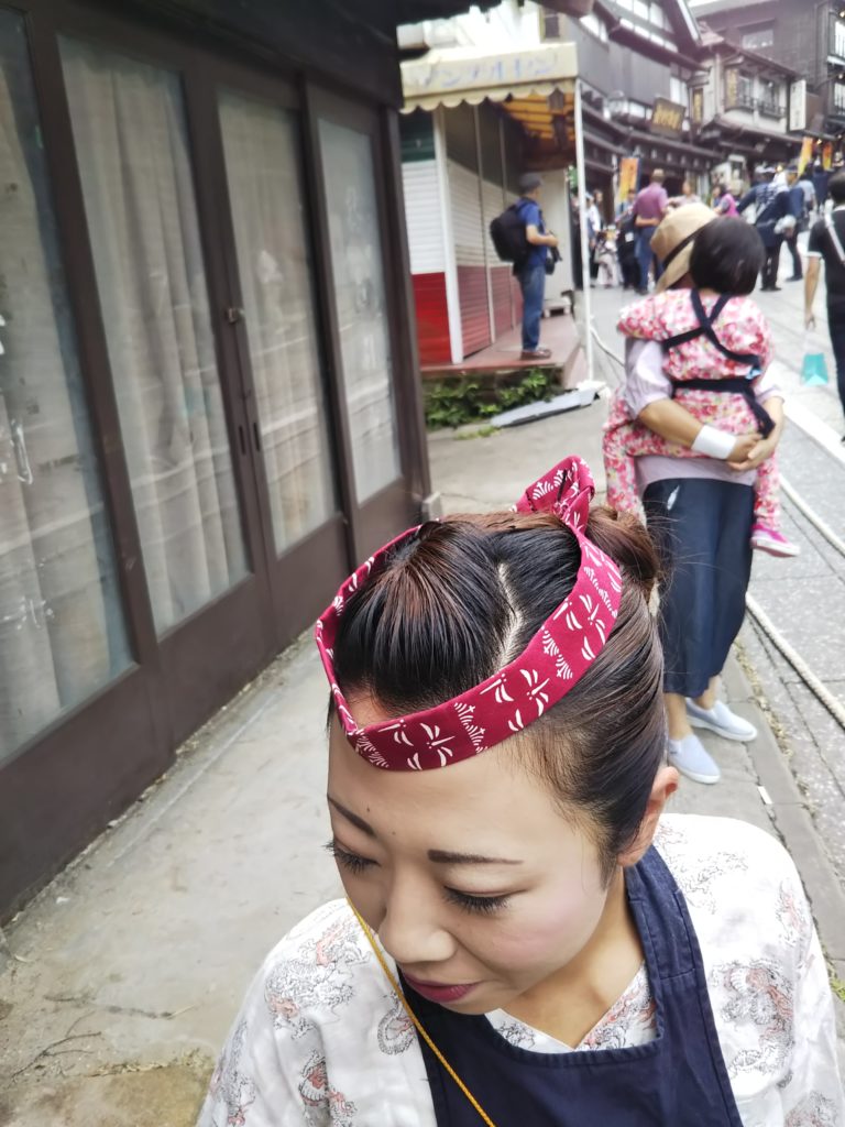 同じねじりはちまきの中でも女性は、額に巻くのではなく、小さめに作って額にかかるように頭に載せます。かわいいよね。女性が好んで使っています。とっても可愛いから、お姫様のティアラ、Princess’ Tiara headbandかな。