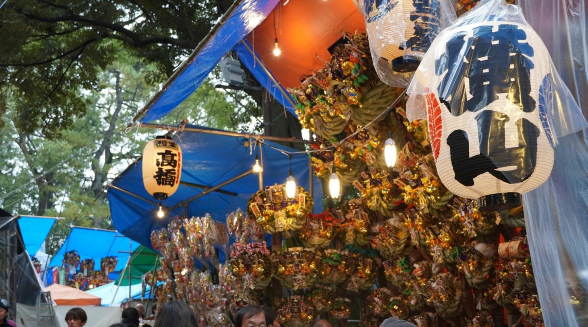 大湯祭開催日に氷川神社の周辺に立つ酉の市