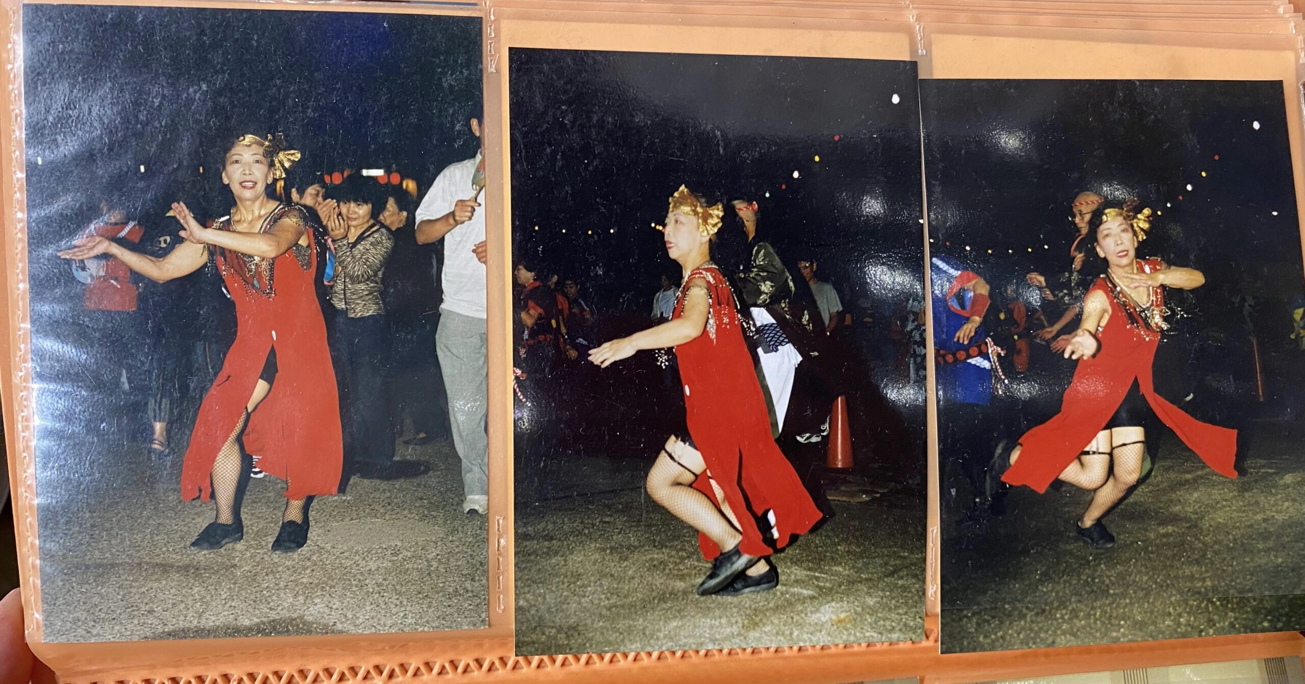 最初は踊り方知らないから、足を覚えようおもたら手がでけへん、手を覚えようおもたら足がでけへん。だから見てるだけ、壁の花やったのよ(笑)。でも踊っているうちにだんだんと好きになってきて。でも、2〜3年経つうちに町内会の盆踊りがなくなってしまった。他所(の盆踊り大会)へ行こうおもたって、一人ではやっぱよう行けへんから。