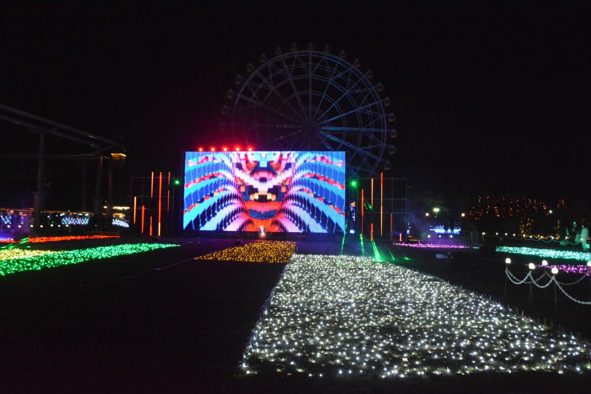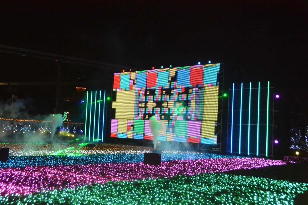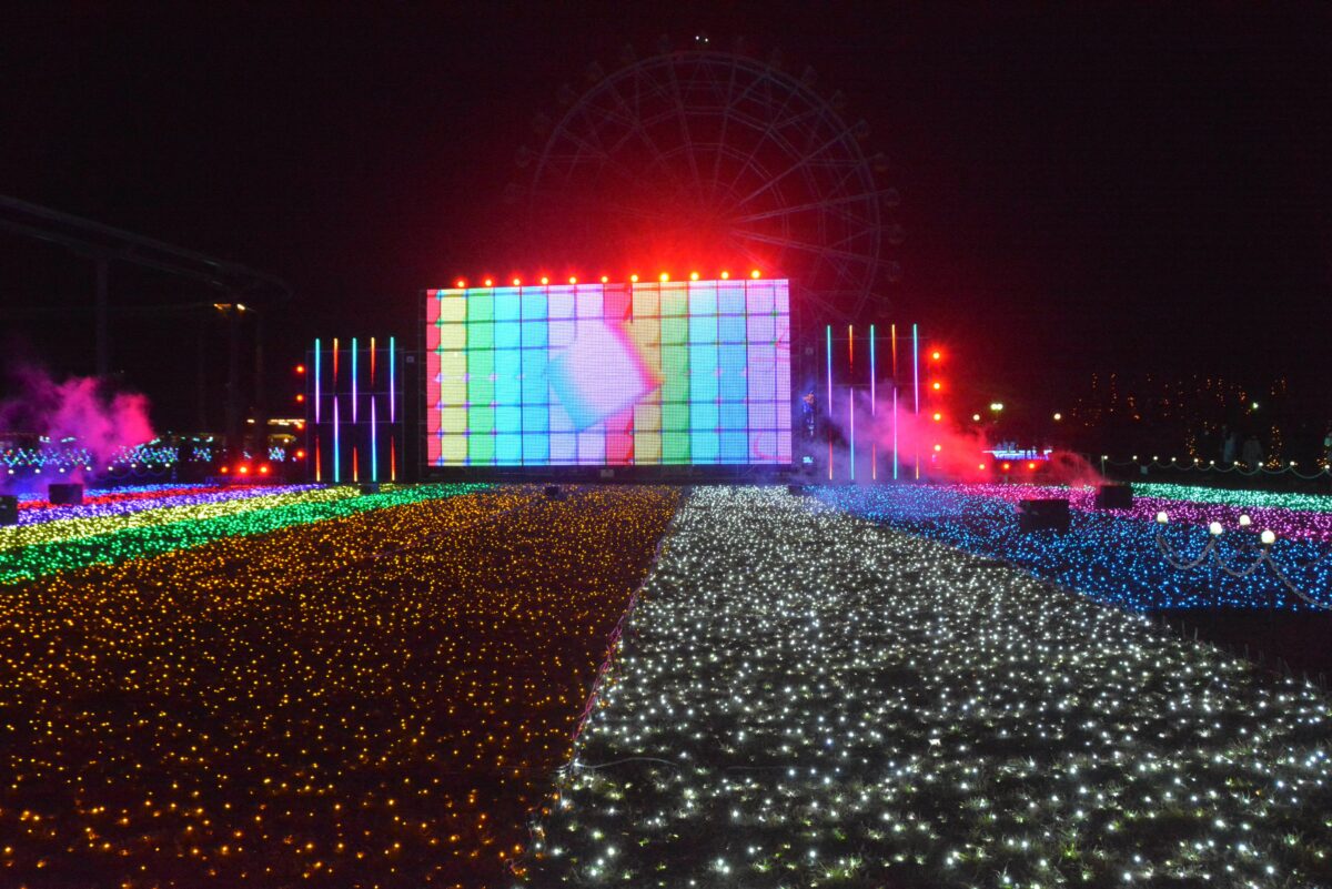 ハートフルガーデンの南に接するイベントエリアでは、音と光のショー「リズミネーション」が行われます。軽快な音楽に合わせて躍動感あふれるCG映像が映し出されるのです。