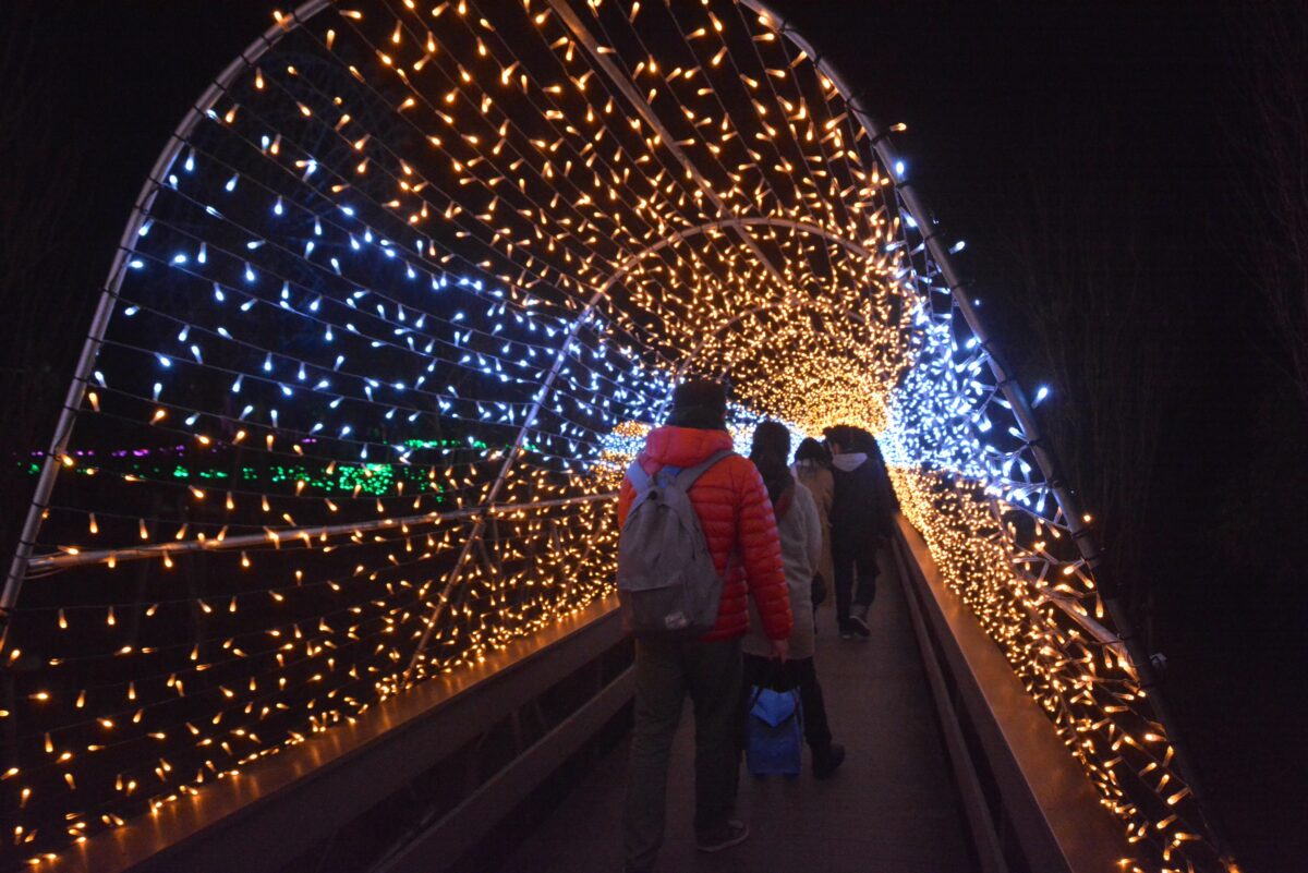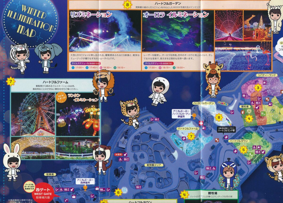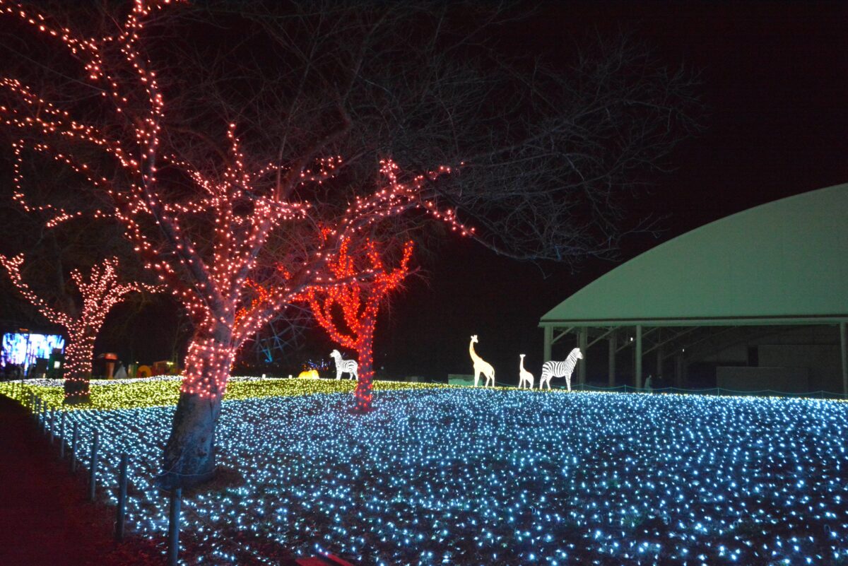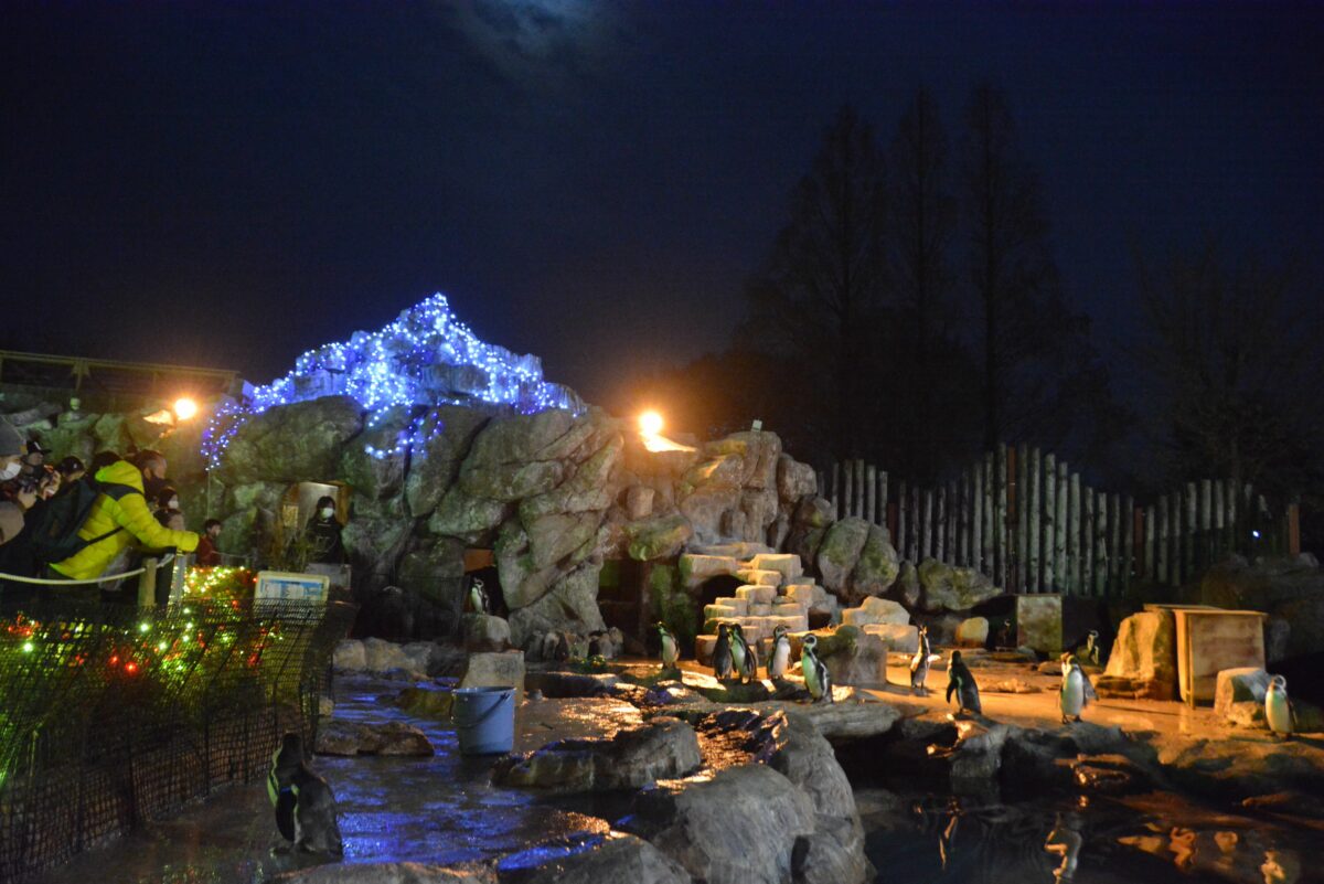 ハートフルファームからさらに西に向かうと動物園のエリアとなります。ホワイトタイガーが暮らすキャットワールドの入口では猛獣がライトアップされます。ペンギンの大地では、フンボルトペンギンなどもイルミネーションを楽しんでいるようです。