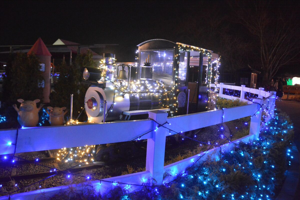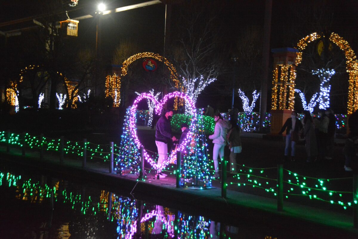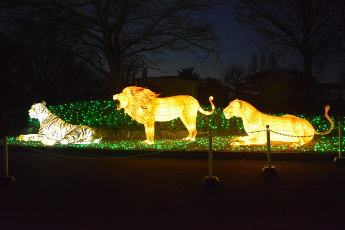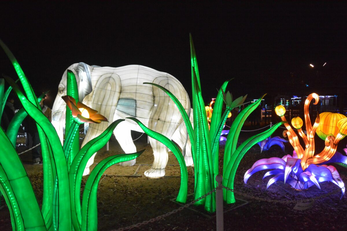 ハートフルファームからさらに西に向かうと動物園のエリアとなります。ホワイトタイガーが暮らすキャットワールドの入口では猛獣がライトアップされます。ペンギンの大地では、フンボルトペンギンなどもイルミネーションを楽しんでいるようです。