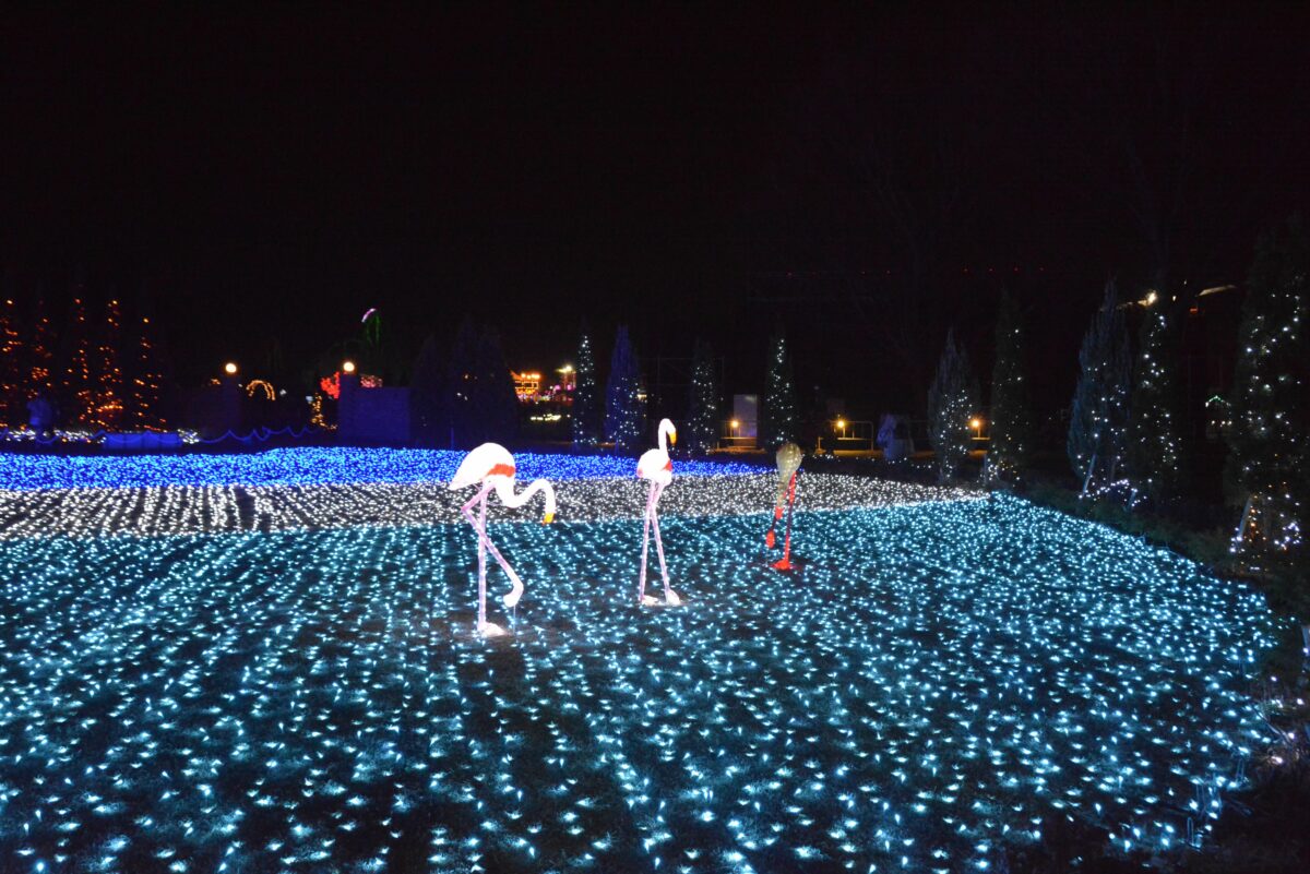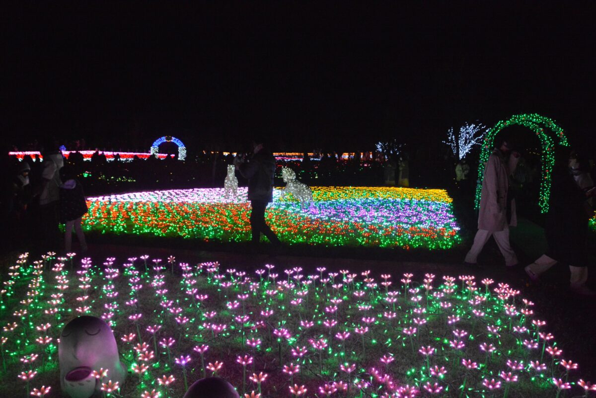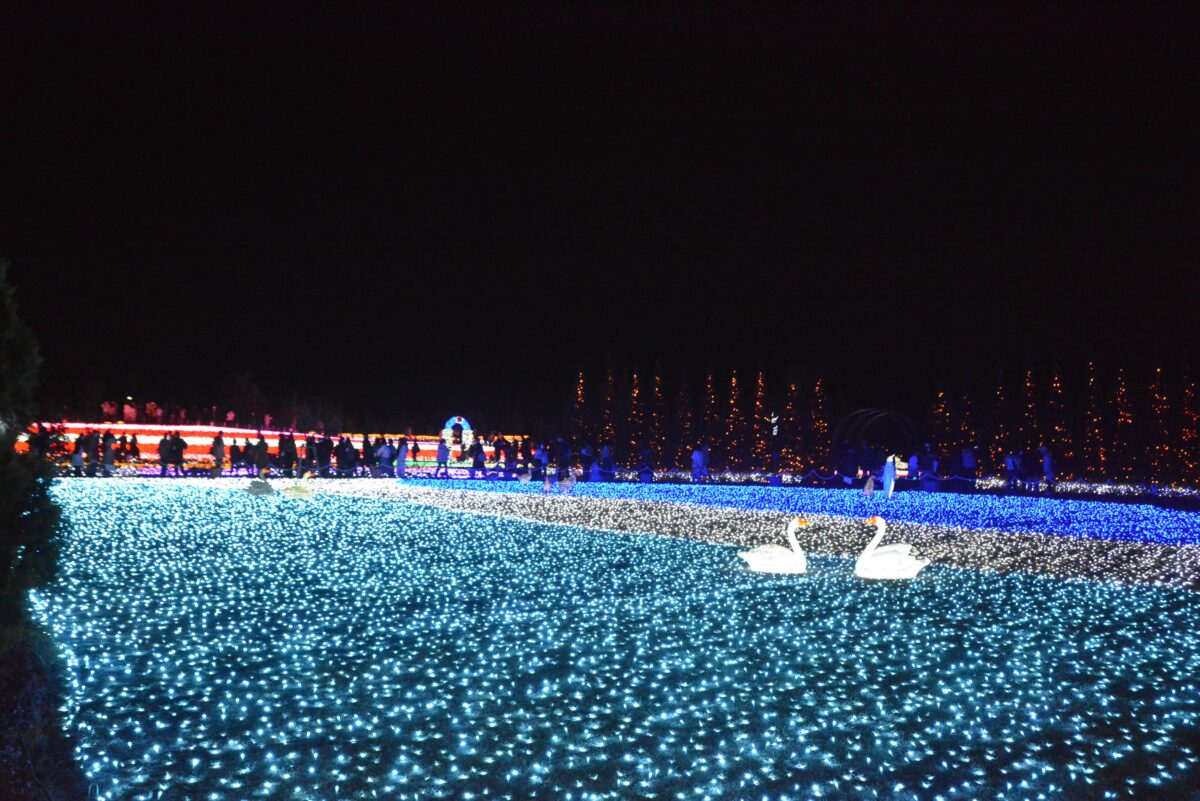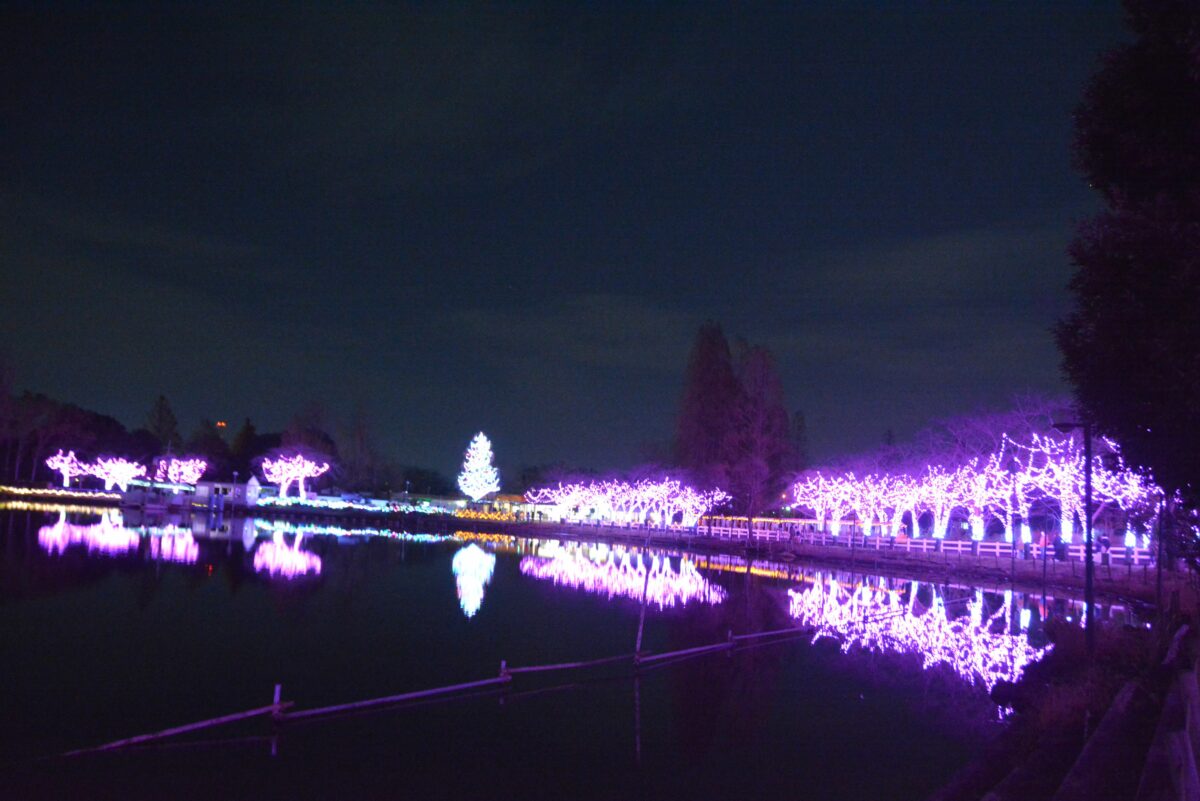 白鳥の池の西に穏やかな水を湛える鯉牧場の中にはイルミネーションタワーが設置され、水面に鮮やかな彩りを映り込ませています。鯉牧場の北のリバティーランドでは光の絨毯に数々の動物が浮かび上がります。