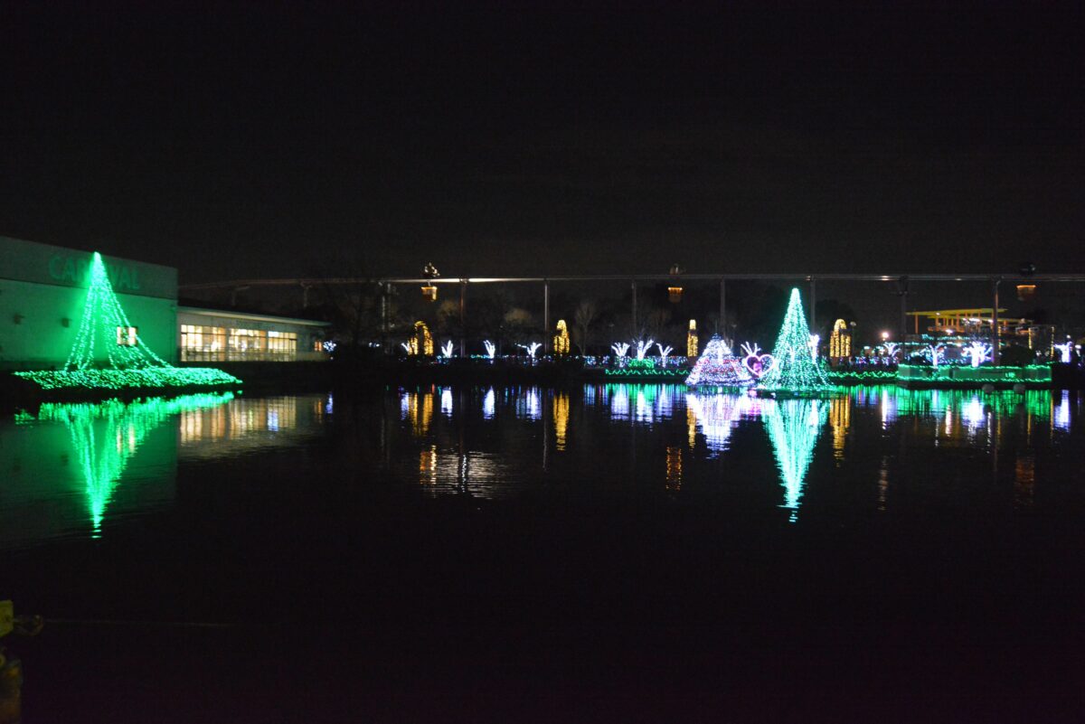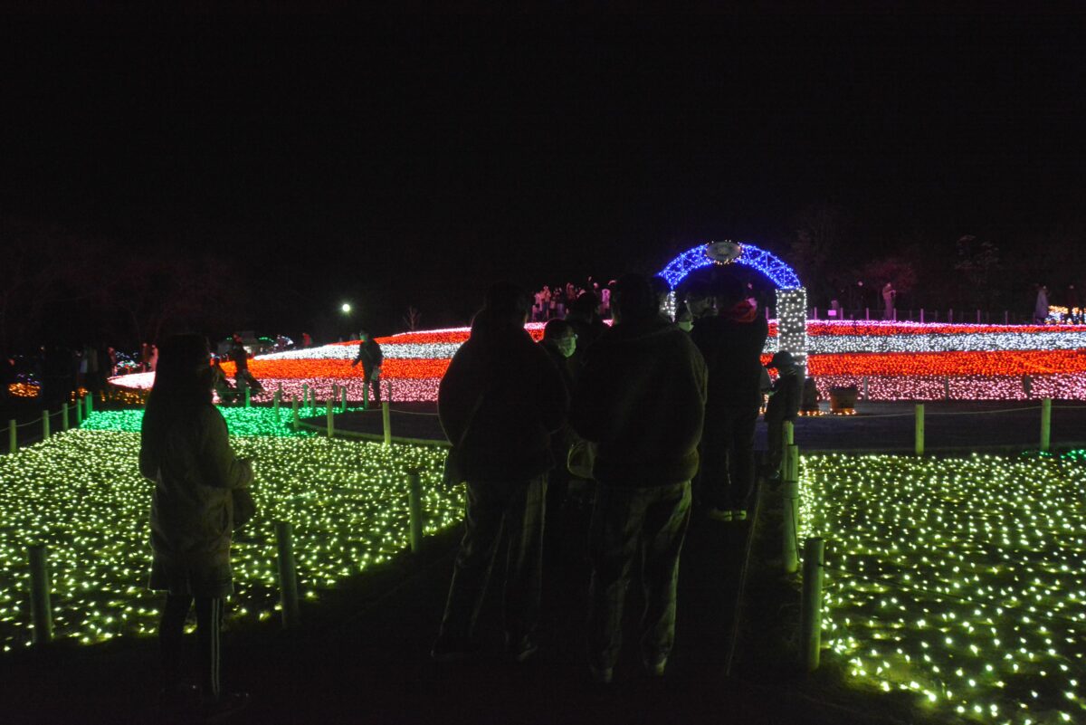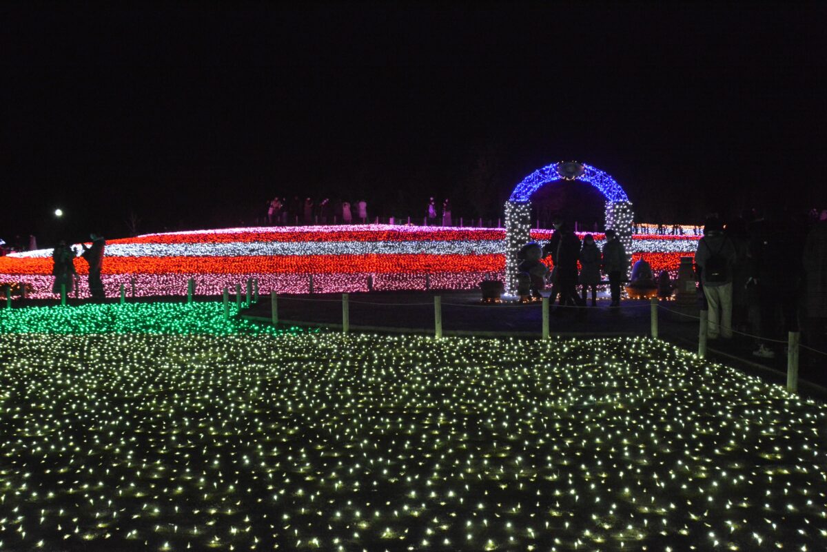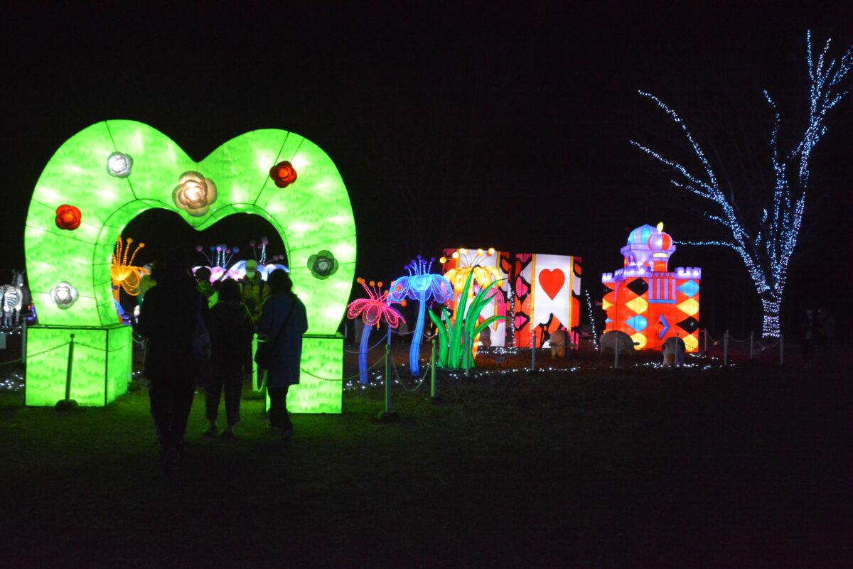 白鳥の池の西に穏やかな水を湛える鯉牧場の中にはイルミネーションタワーが設置され、水面に鮮やかな彩りを映り込ませています。鯉牧場の北のリバティーランドでは光の絨毯に数々の動物が浮かび上がります。