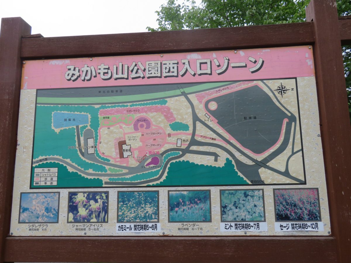 みかも山公園は、関東平野の北端に標高約230メートルで聳える三毳山の麓を囲む栃木県最大の公園です。南北は3キロを超え、東西にも1キロを超えます。みかも山ハーブ園は、みかも山公園の北西端の西口ゾーンにあります。公園には東口、南口、西口の3つの入口があり、各々に駐車場が設けられています。ところが、西口エリアにはバス停がありません。公共交通機関を利用してみかも山ハーブ園に行くには、東武線またはJR両毛線の栃木駅、静和駅、岩舟駅などから、栃木市のふれあいバスに乗車し、公園の東口近くの「とちぎ花センター」停あるいは 南口近くの「道の駅みかも」停で下車後、公園内で運行されているフラワートレインを利用せざるをえません。