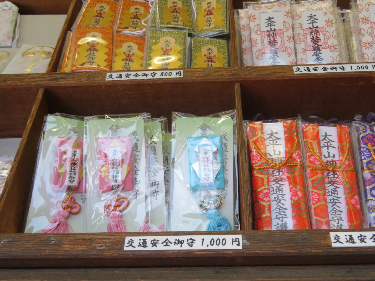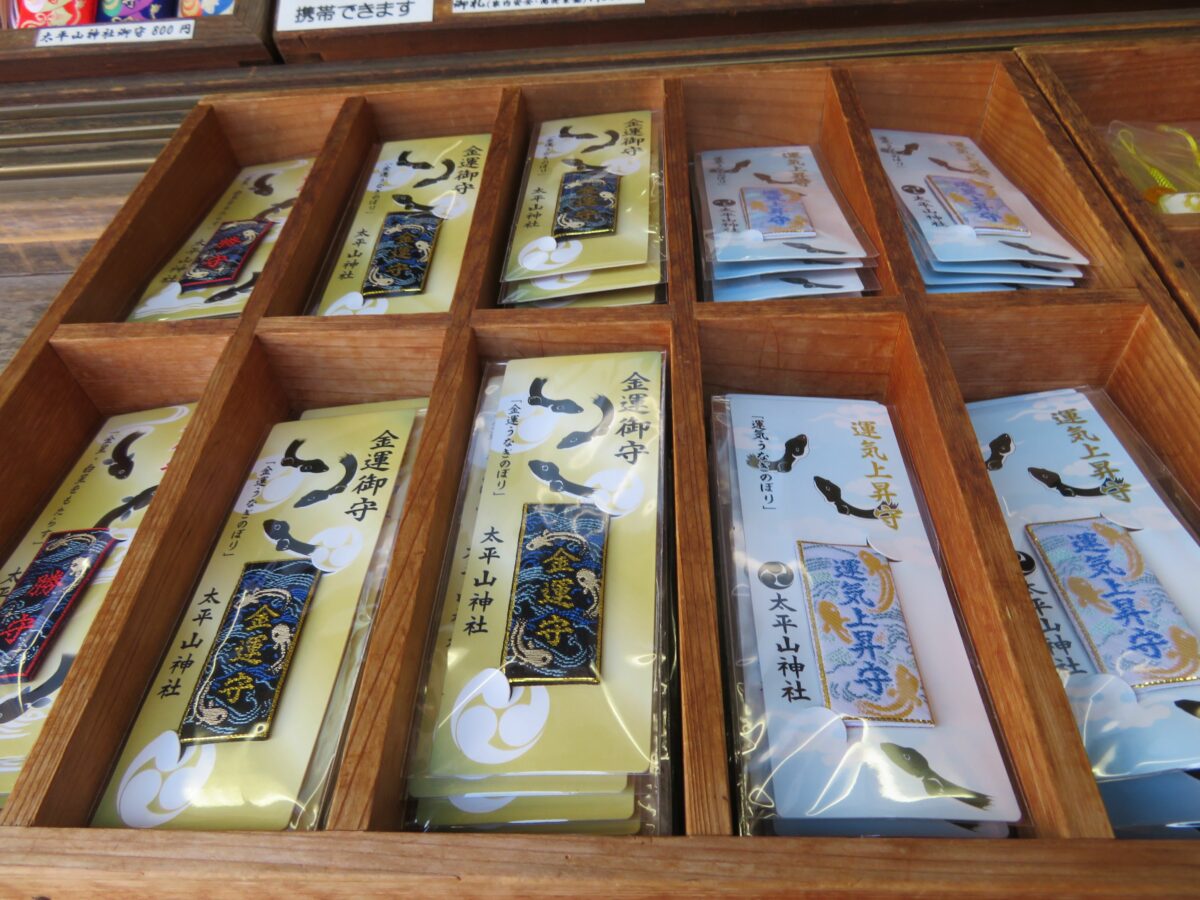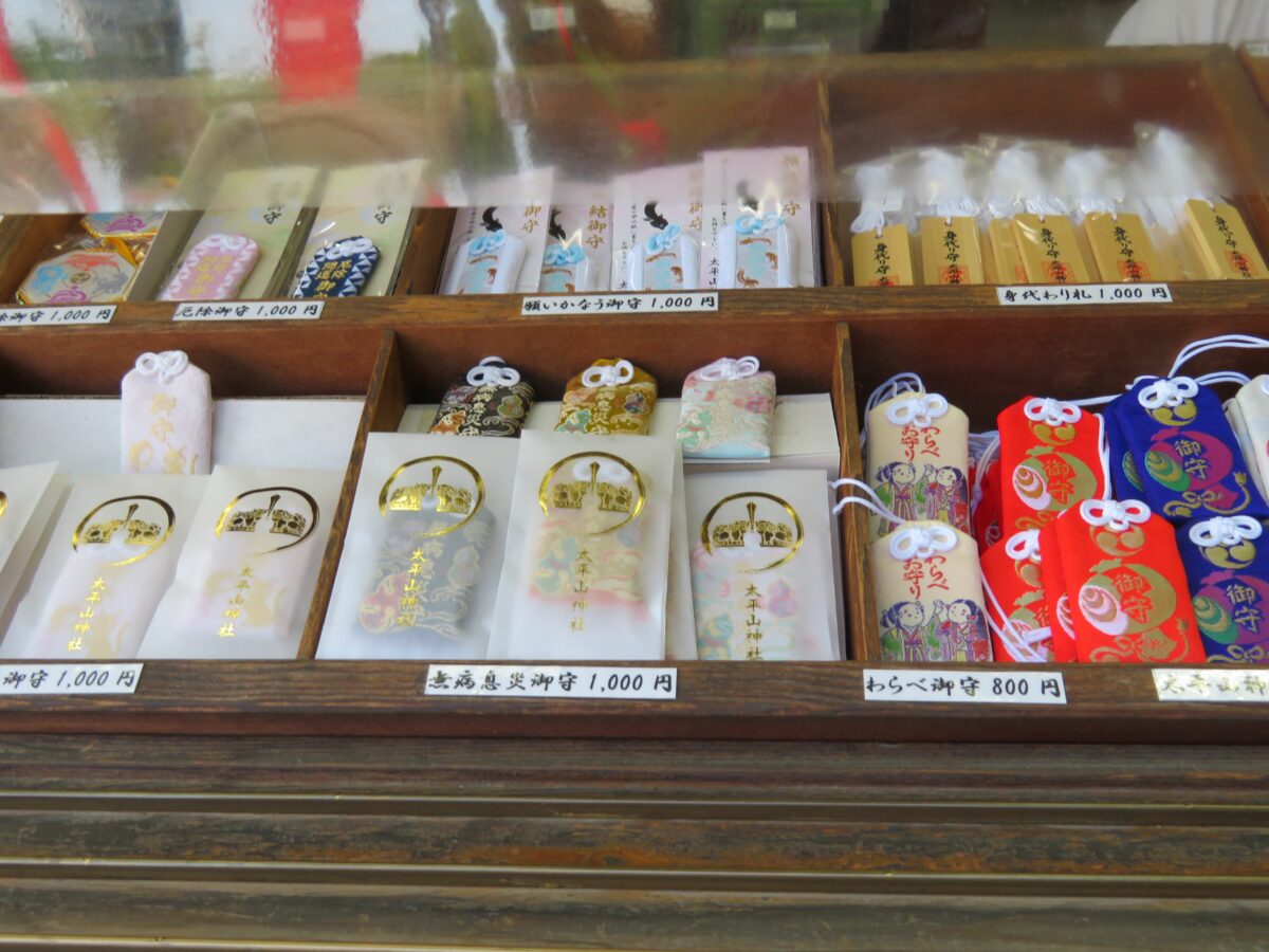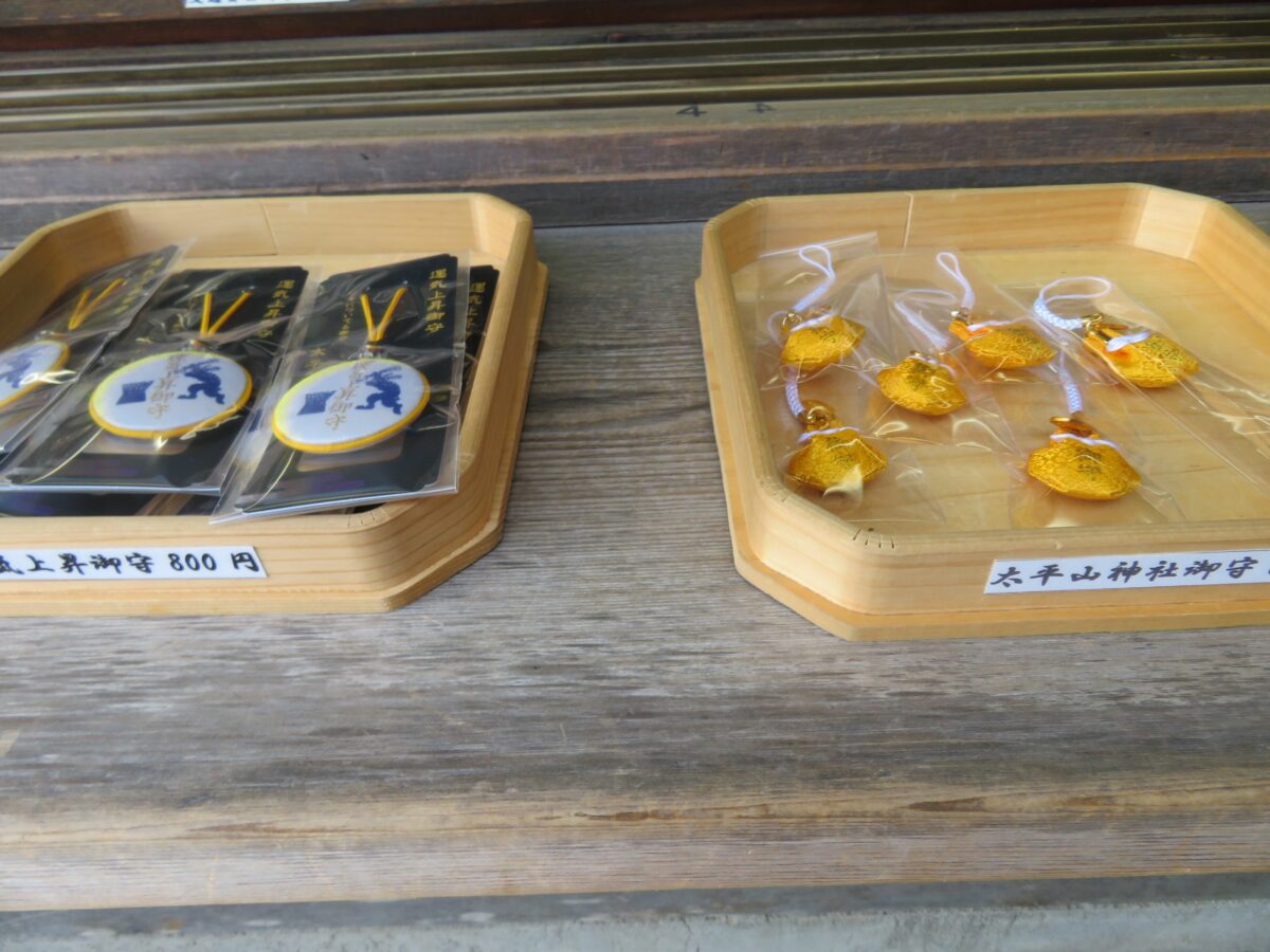 太平山神社では本殿の西に隣接する授与所で御朱印を頂くことができます。授与所には御朱印ばかりでなく、お守りやお札などの授与品が準備されています。バラエティー豊富な授与品の中には、めかご鈴、火防獅子の土鈴に目を引かれます。太平山神社には火防獅子の伝説が伝わります。戦国時代に北条氏政の侵攻によって太平山が戦場となったとき、火の手が回った神社に獅子像が舞い上がり雨を降らせ、ご神体を守ったと言われています。