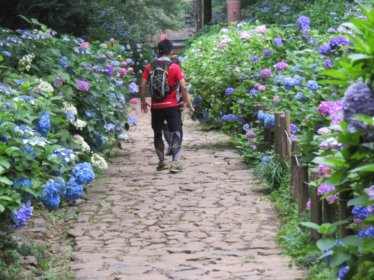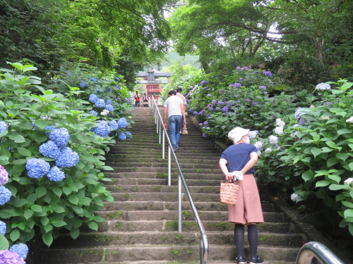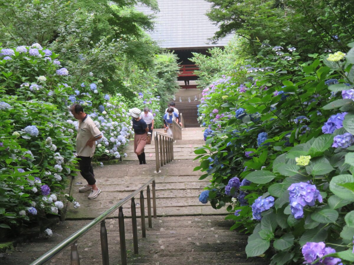 あじさいの花が左右を彩る石階段