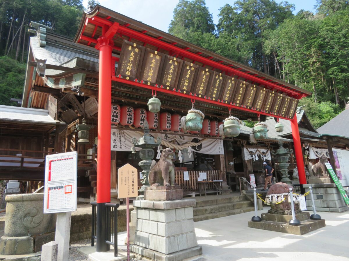 太平山神社は栃木市の西部で約340メートルの標高で聳える太平山の山頂付近に社殿を構えています。827年に慈覚大師円仁によって創建されたと伝わります。江戸時代には徳川将軍家の手厚い保護を受けました。境内中央の本殿の傍らには、数多くの境内社がずらりと並び、交通安全、安産、豊作など神社ごとに異なるご利益があるとされています。
