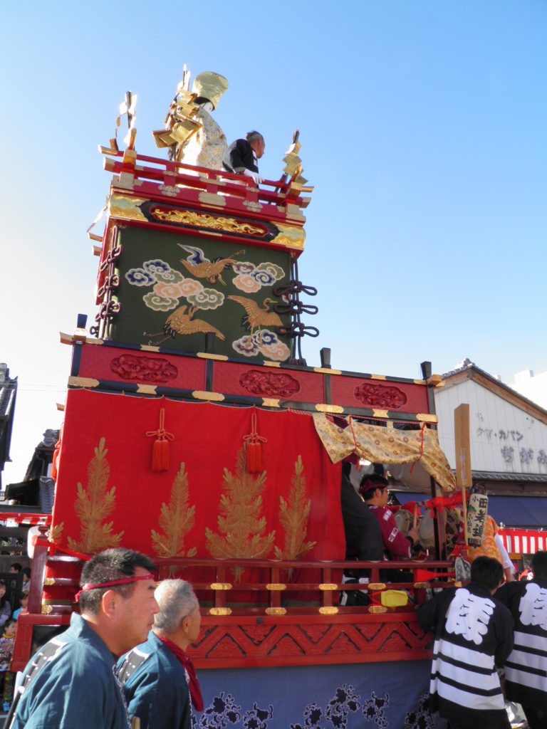 山車が近づいてくると最上部に視線を向けてしまうものですが、山車の構造にも注目したいものです。人形の足元には上下可動式の2層の空間が設けられています。これは山王祭などで山車より低い江戸城の門を潜る際に、スライドして山車の高さを調整する江戸型山車の流れを汲んだものなのです。各々、繊細な彫刻や、金糸、銀糸で花や鳥、龍、鳳凰などが刺繍された上段幕、見送り幕で囲まれています。