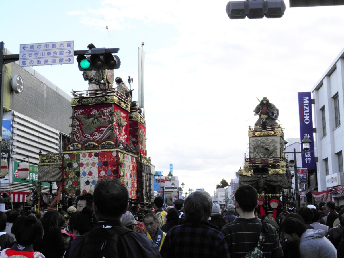 「蔵の街大通り」では絶え間なく山車の巡行が行われていますが、例幣使街道、日ノ出町、栃木駅前、巴波川沿いなどでも山車に遭遇します。突然山車を目にするのは人間だけではなく、山車も他の山車と向い合せとなることがあります。複数の山車がぶつかりそうになる「ぶっつけ」の時は、山車の引き手は提燈を高く振りかざし、大きな掛け声をかけながら、お囃子のボリュームを上げます。あたり一面に響き渡るお囃子の競演は、「とちぎ秋まつり」の最大の魅力です。勢い余ってお囃子の調子を外してしまった山車が、道を譲ることがルールとなっています。