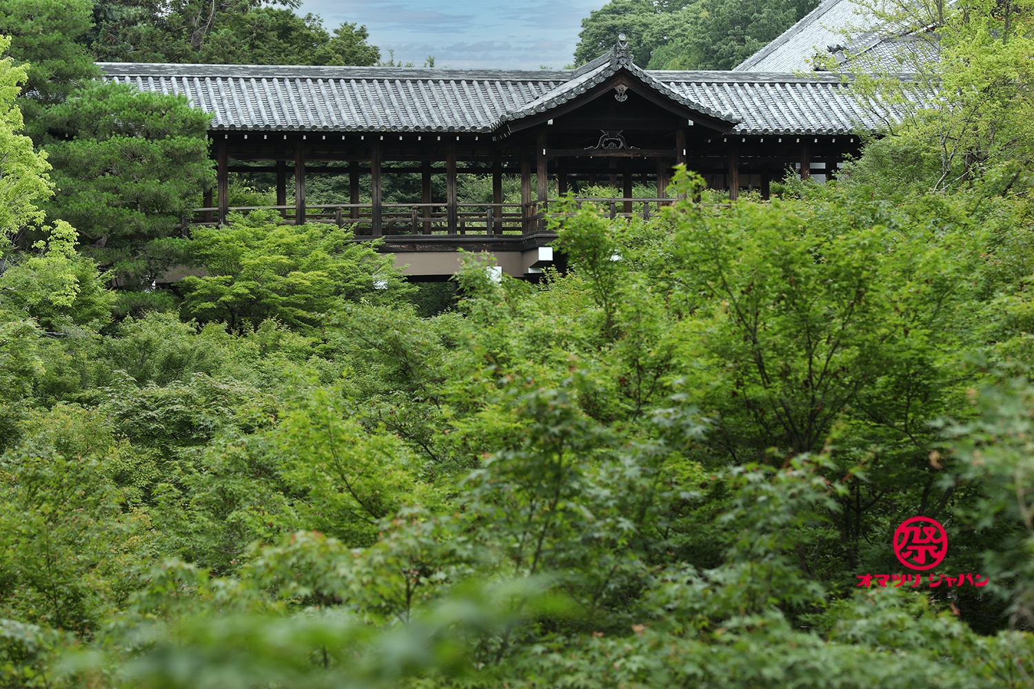 写真:渓谷を埋め尽くす青もみじ。東福寺三名橋のひとつ「通天橋」からの眺め。