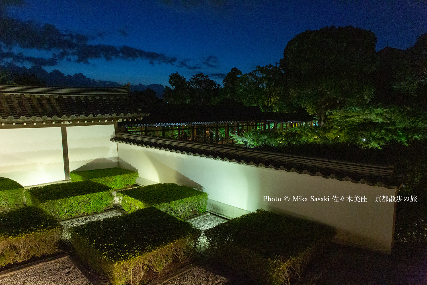 「八相の庭」という東西南北に四庭が配置されています。白壁の手前には四角くモダンなデザインの植木、その奥には通天橋。この美しい景色を青もみじライトアップでも楽しめます。