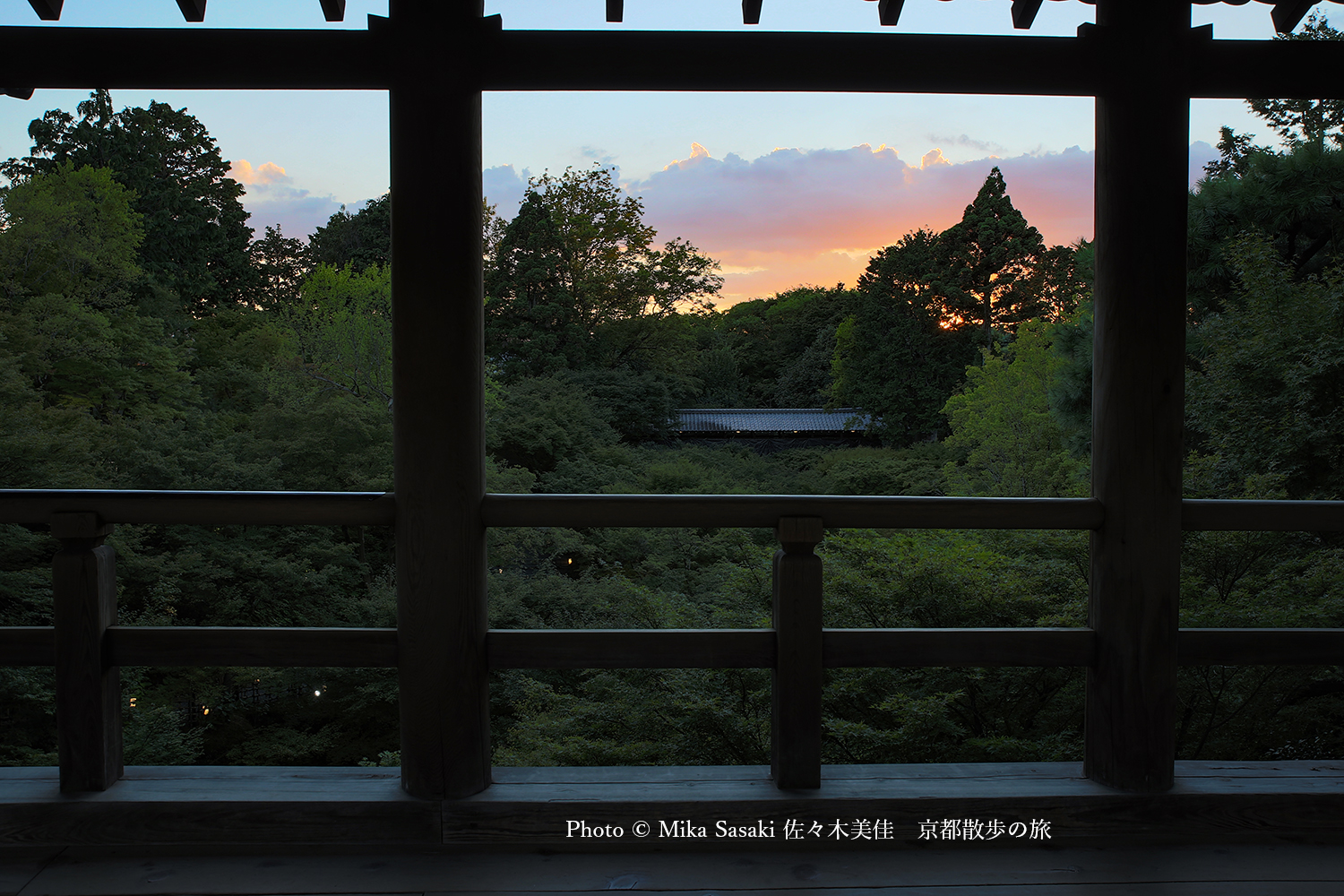 お庭に入り、しばらくすると夕焼けが始まりました。何度も訪れていますがこの季節の夕焼けは初めての光景ため、感激。