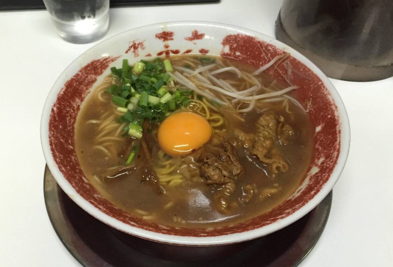 地元で長く愛されてきた中華そばは、豚骨スープに濃口醤油を合わせた濃い茶色のスープが特徴。甘辛く煮付けた薄切り肉、もやしやメンマ、ネギ、生卵がトッピングされ、ちょっとすき焼き風に、中細ストレート麺を少し甘めの濃厚スープと卵に絡めながらいただきます。