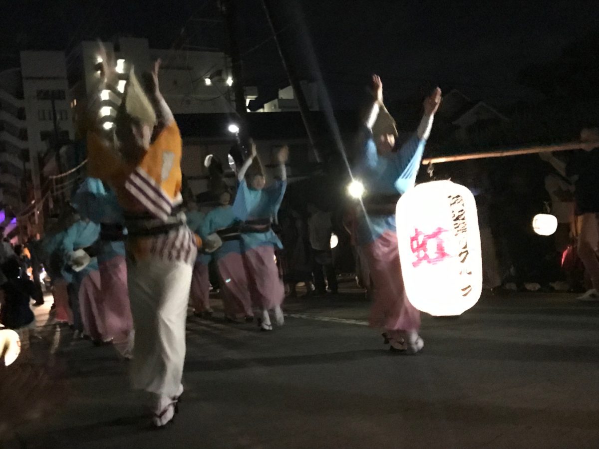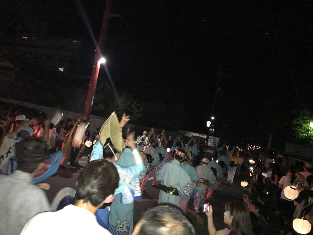 一方、初日の深夜には、眉山のゆもと瑞巌寺では「一丁まわり」が行われます。街頭と手持ち提灯だけの明かりの中で行う踊り。演じるのは阿波踊りグループ「虹」で、主催の四宮賀代さんは徳島空港の阿波踊り像のモデルにもなった伝説的な踊りの名手。その昔、芸者さんたちがお座敷を終えた帰り道、自分たちも三味線を弾きながら静かに踊りを楽しんだという風習を表したもの。
