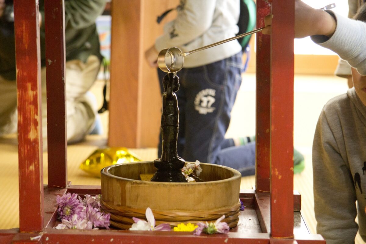 花まつりでは法要に加えて、境内に花で飾りつけた堂(花御堂)に、誕生時のお釈迦さまの姿をかたどった小さな仏像(誕生仏)を安置します。そして、参拝客は誕生仏に甘茶をかけ、子どもの身体健全などを願うのです。