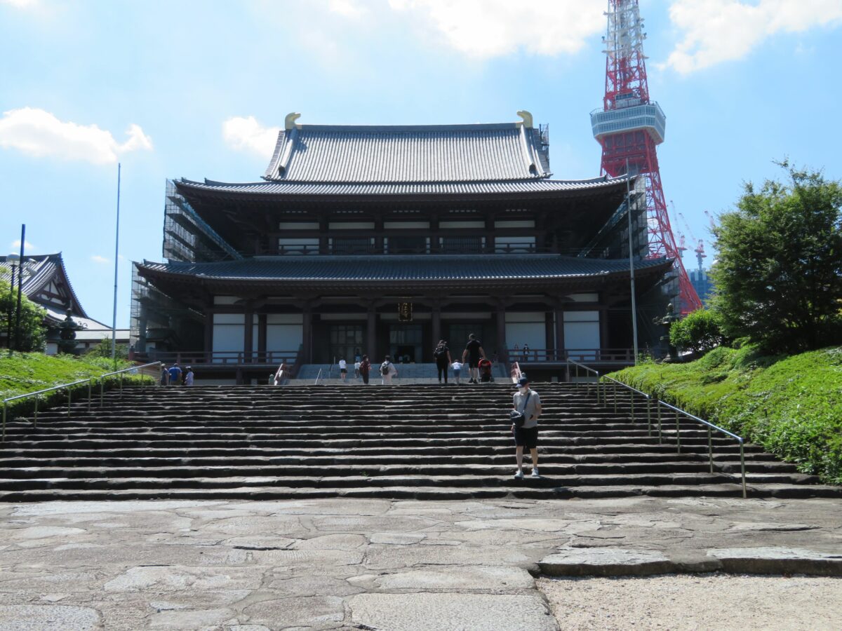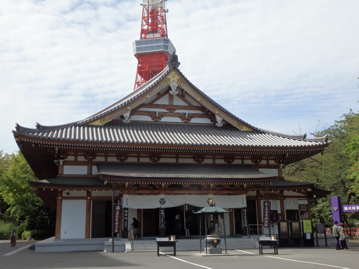 東京タワーを背景とする増上寺の大殿
